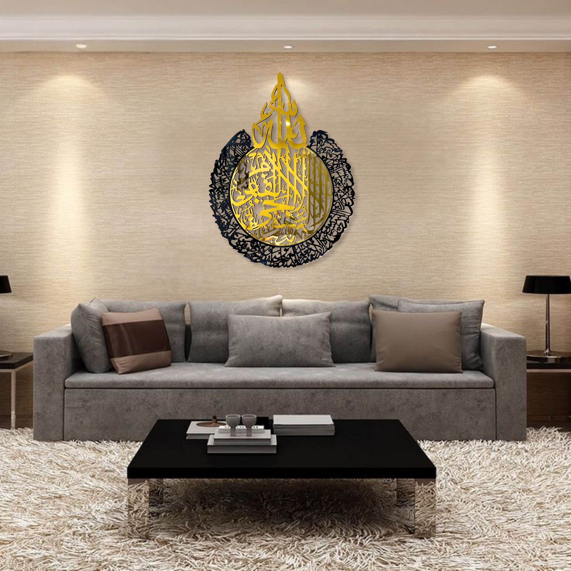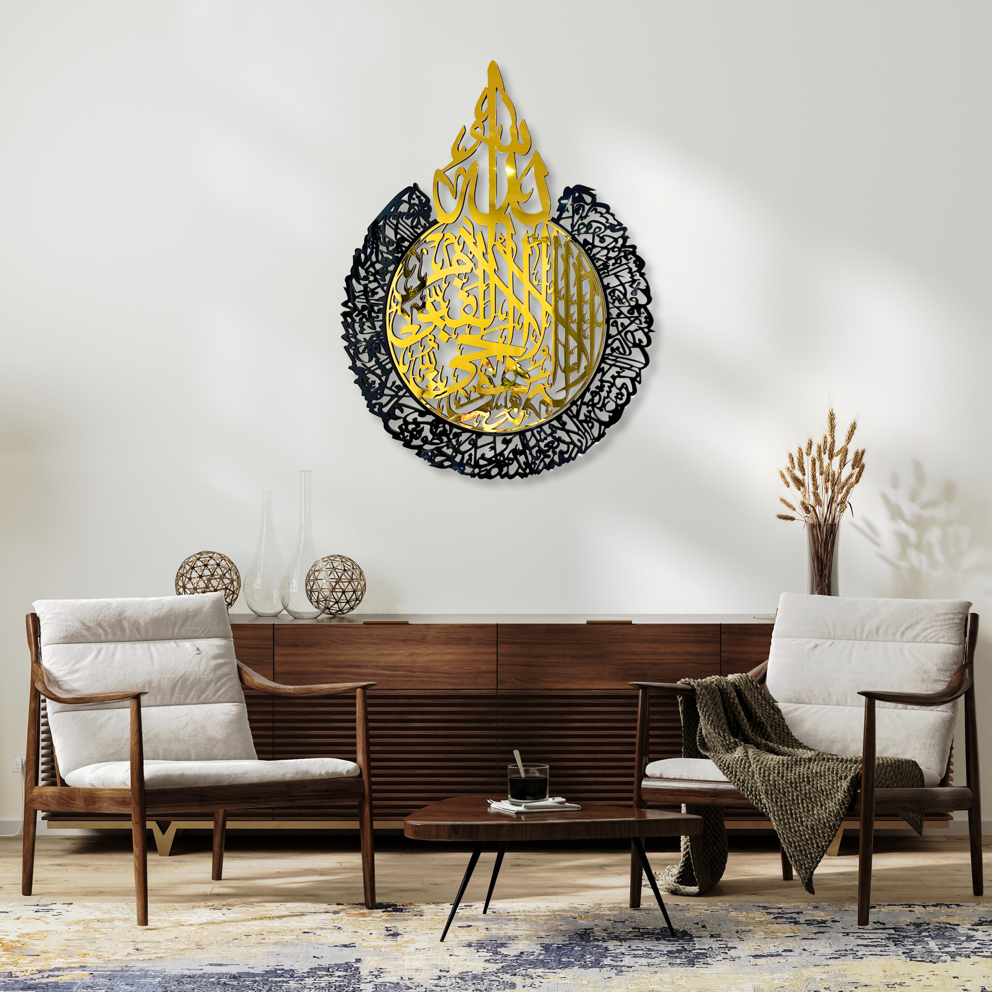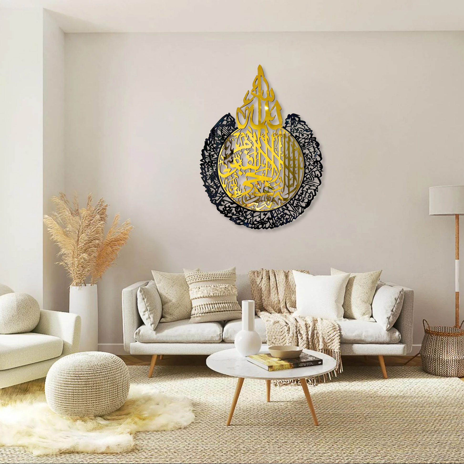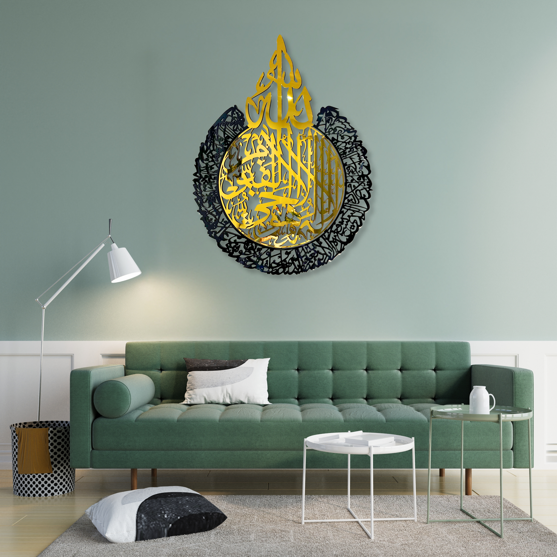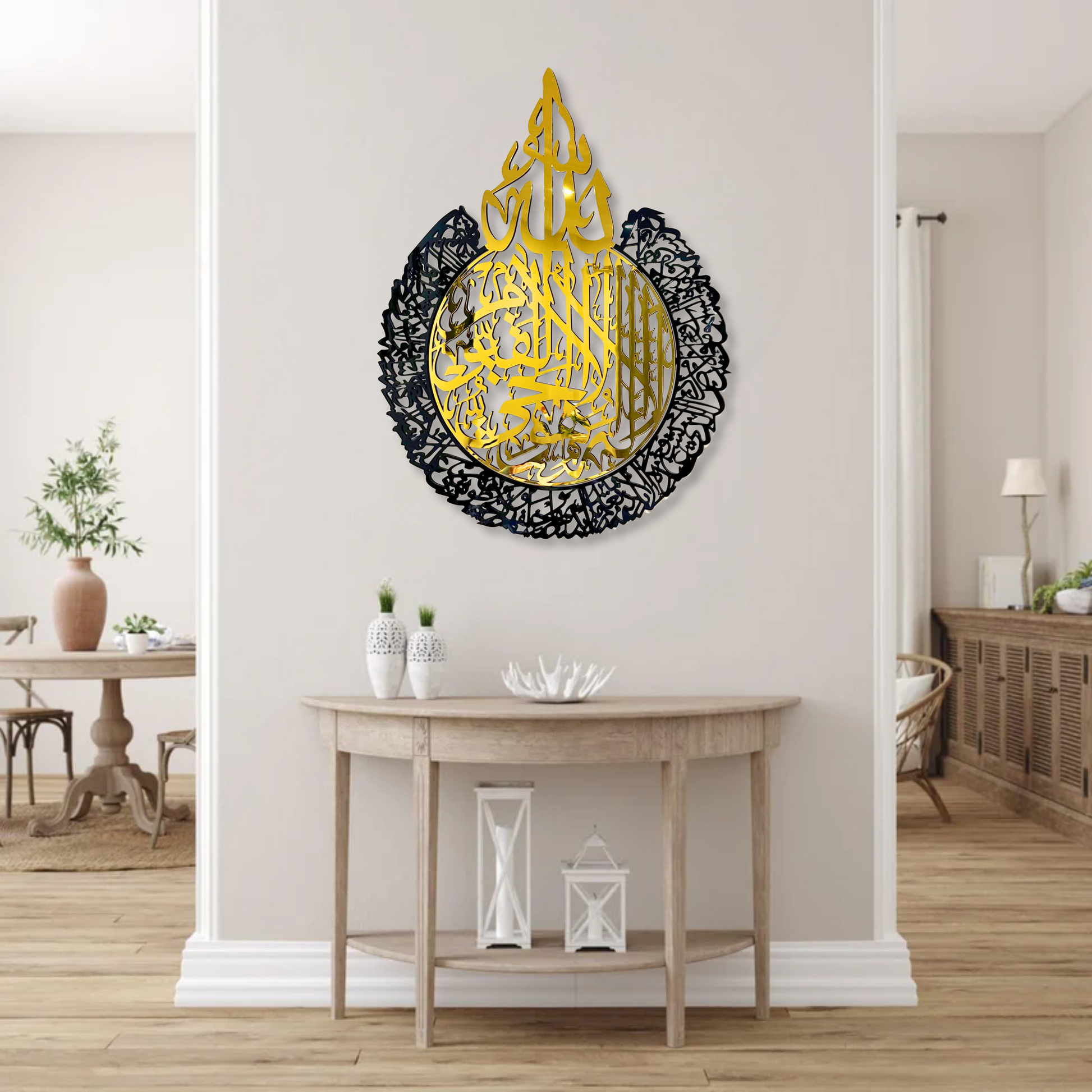 Let the blessings of آية الكرسي (Ayatul Kursi) surround your home with this breathtaking mirror wall piece. Carefully designed in shimmering gold acrylic layered over deep black mirror acrylic, this art isn’t just decoration—it’s your home’s spiritual armor, wrapped in elegance.