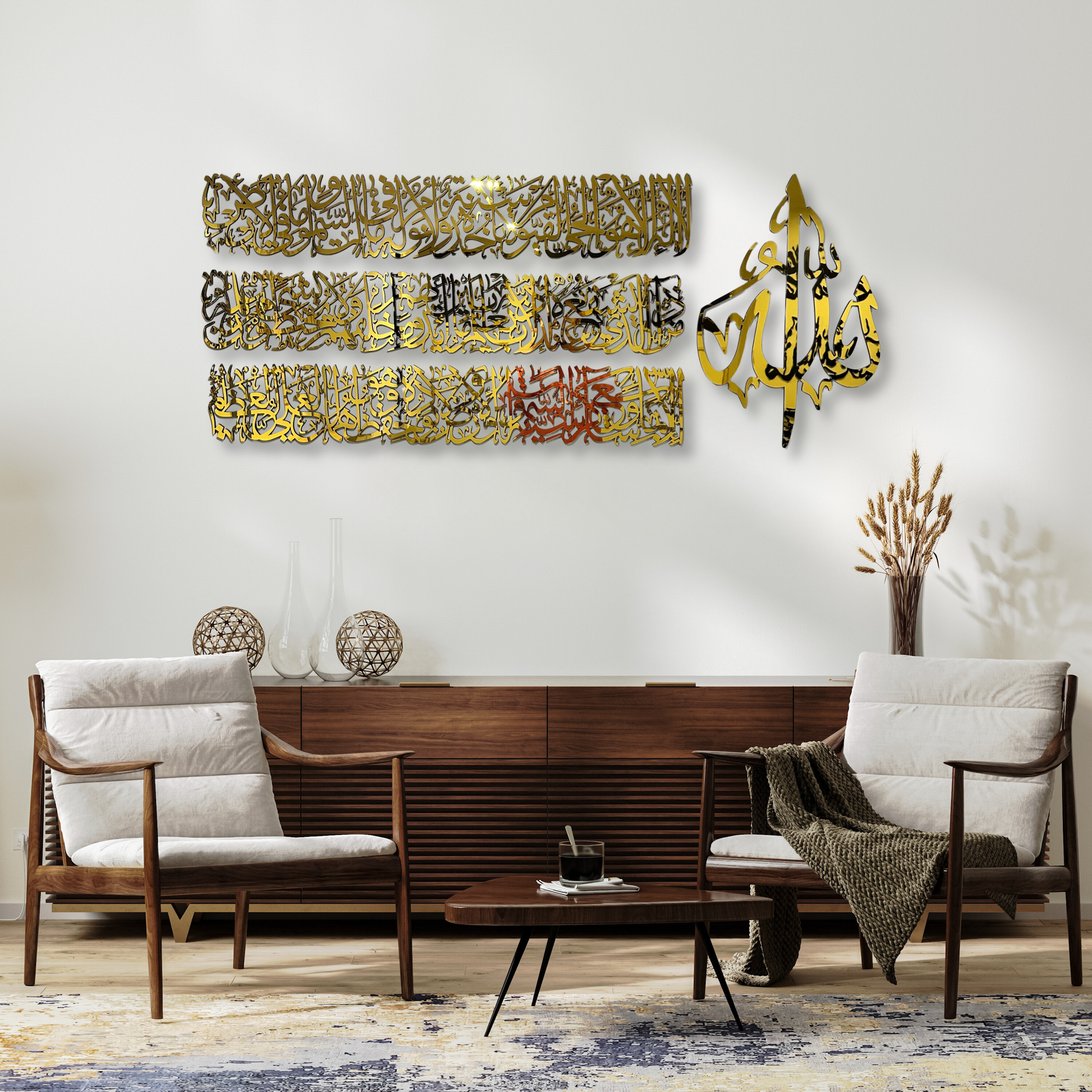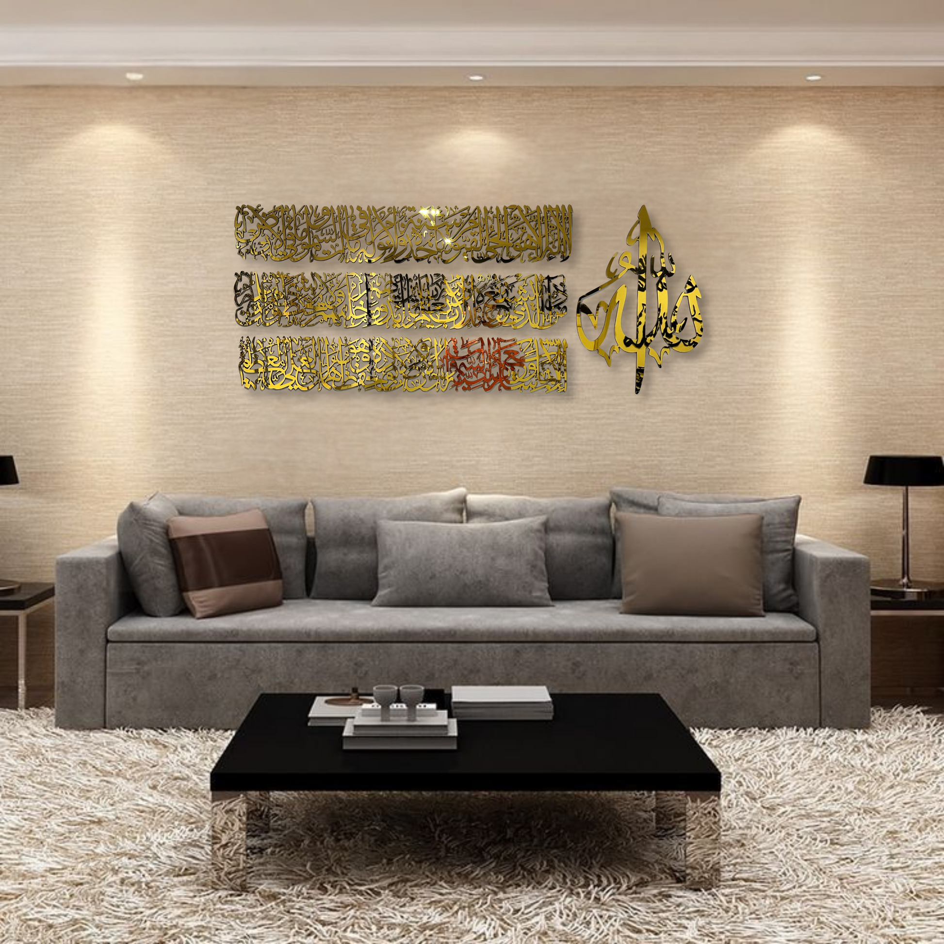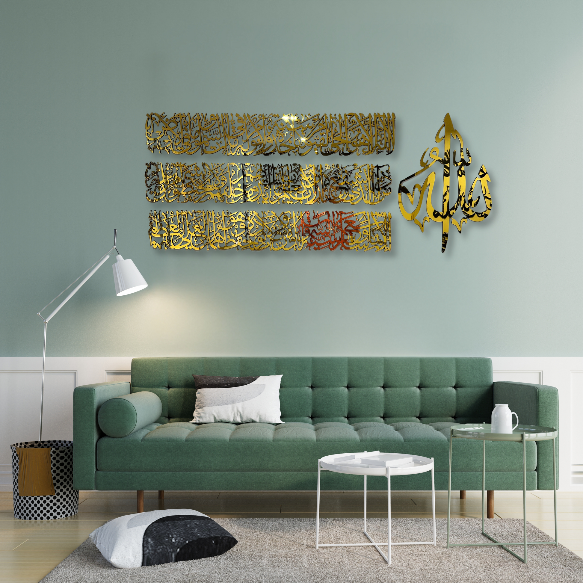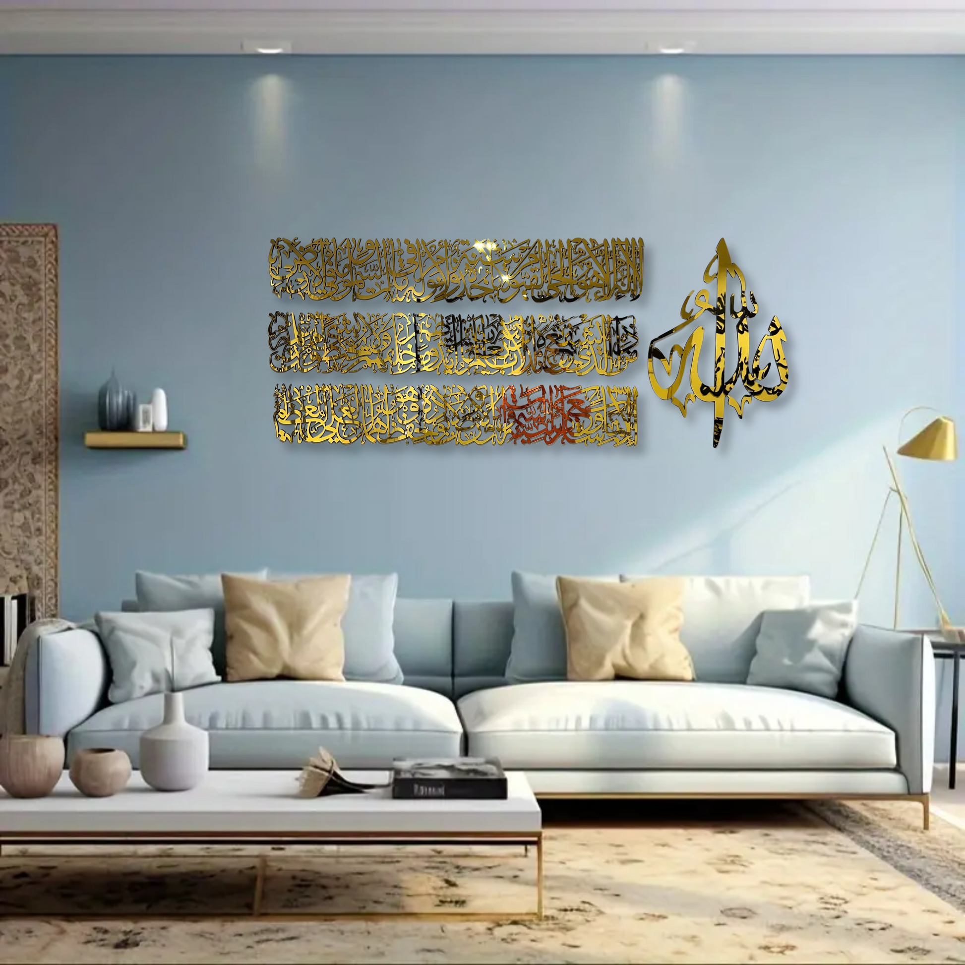 Let your wall speak the words of Allah ﷻ. This breathtaking set features Ayatul Kursi (آية الكرسي)—The Verse of the Throne—beloved for its unmatched protection, peace, and divine strength. Reimagined across four wide gold mirror panels, this design brings barakah and elegance into any space it touches.