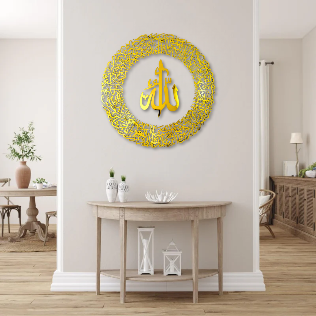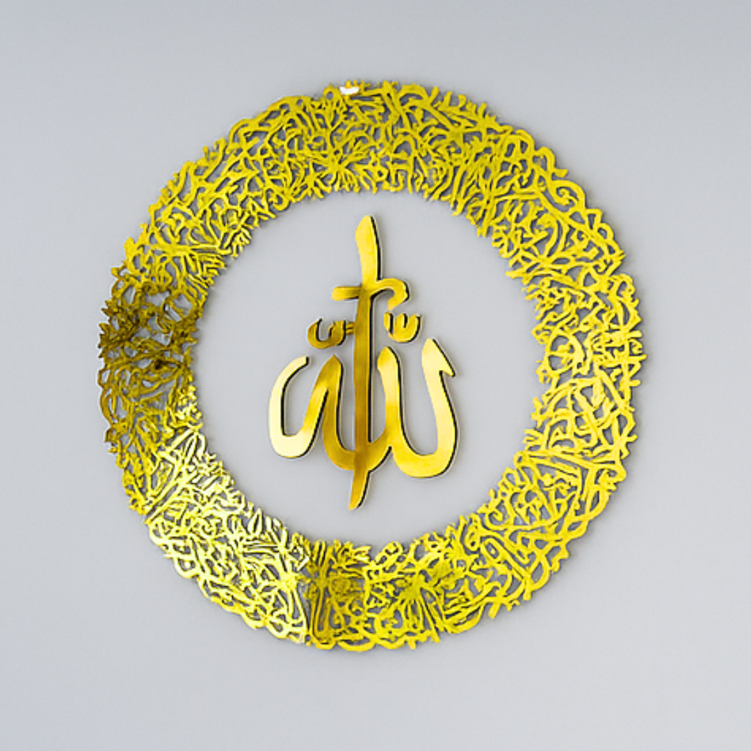 Bring power and beauty into your home with the most protective verse of the Qur’an. This stunning piece displays the complete Ayatul Kursi (آية الكرسي) in a circular design, with Allah (الله) written boldly in the center — a reminder of faith, strength, and divine protection.