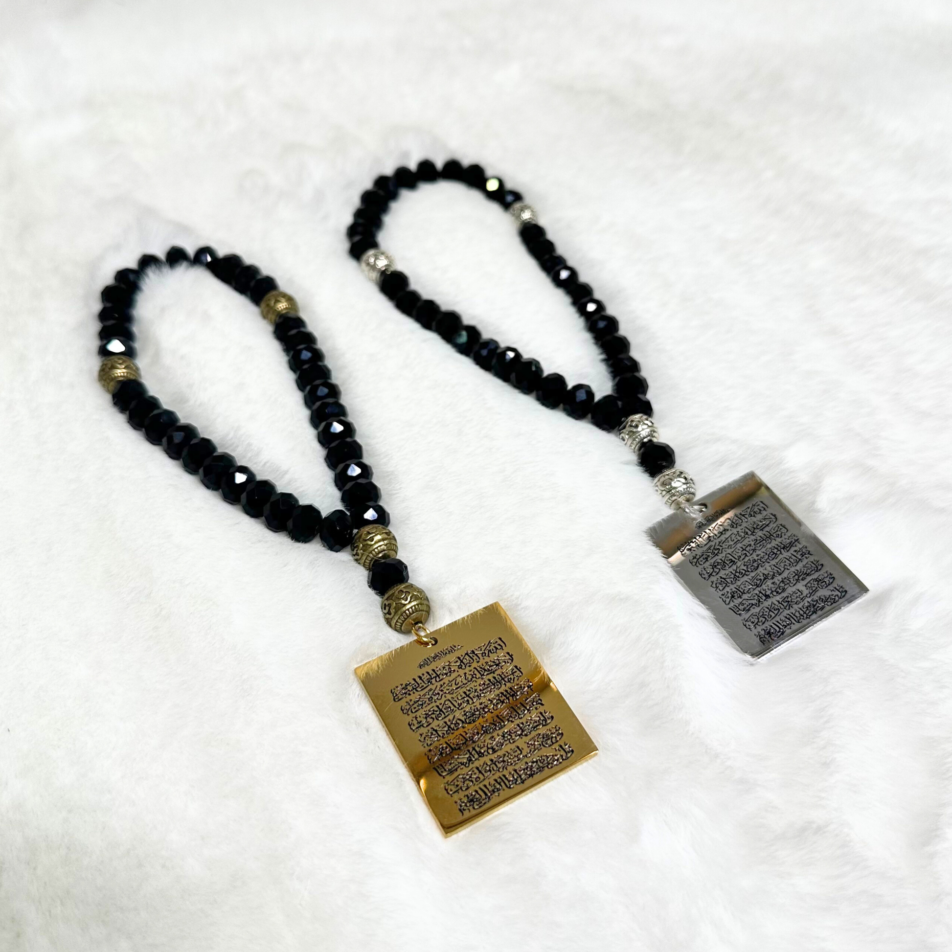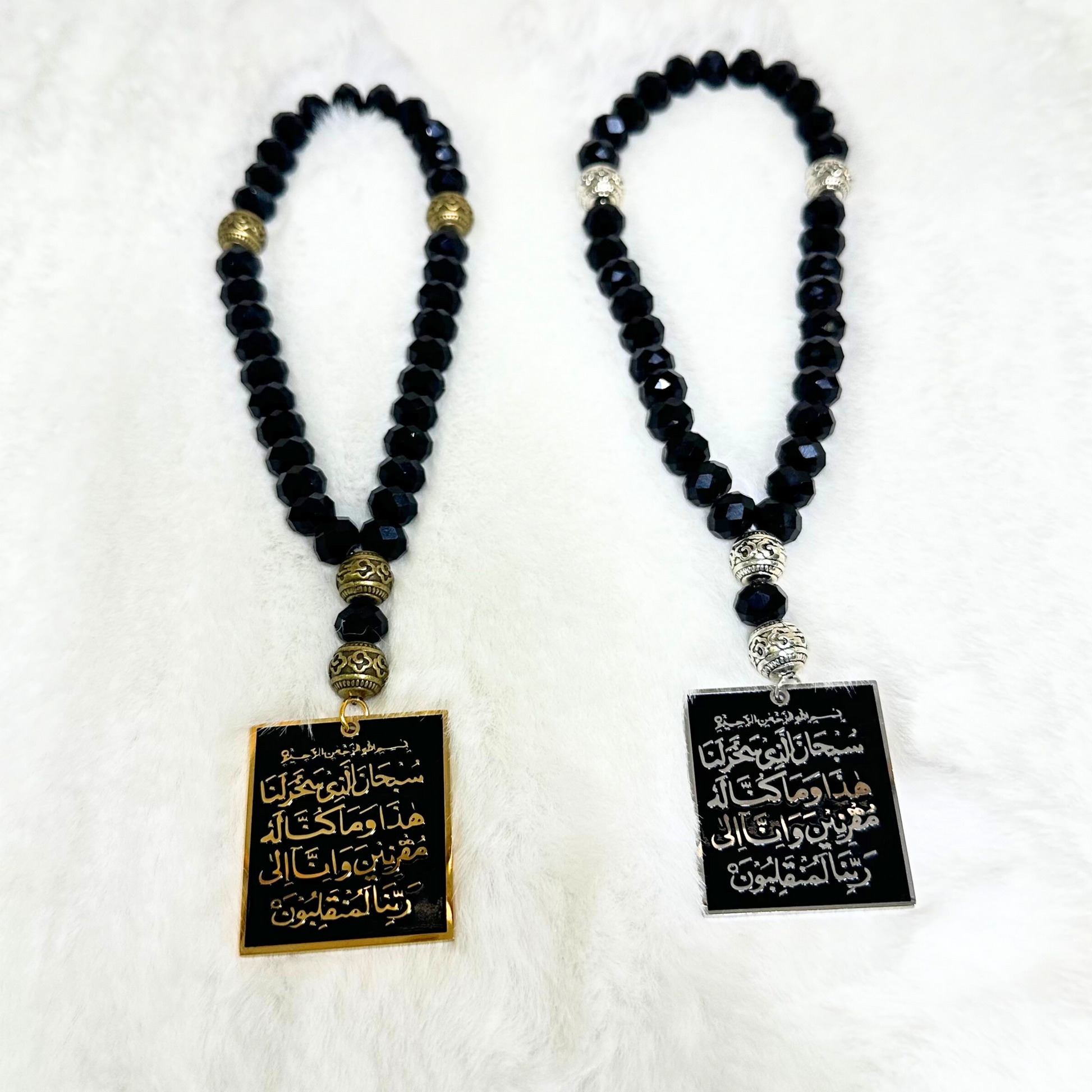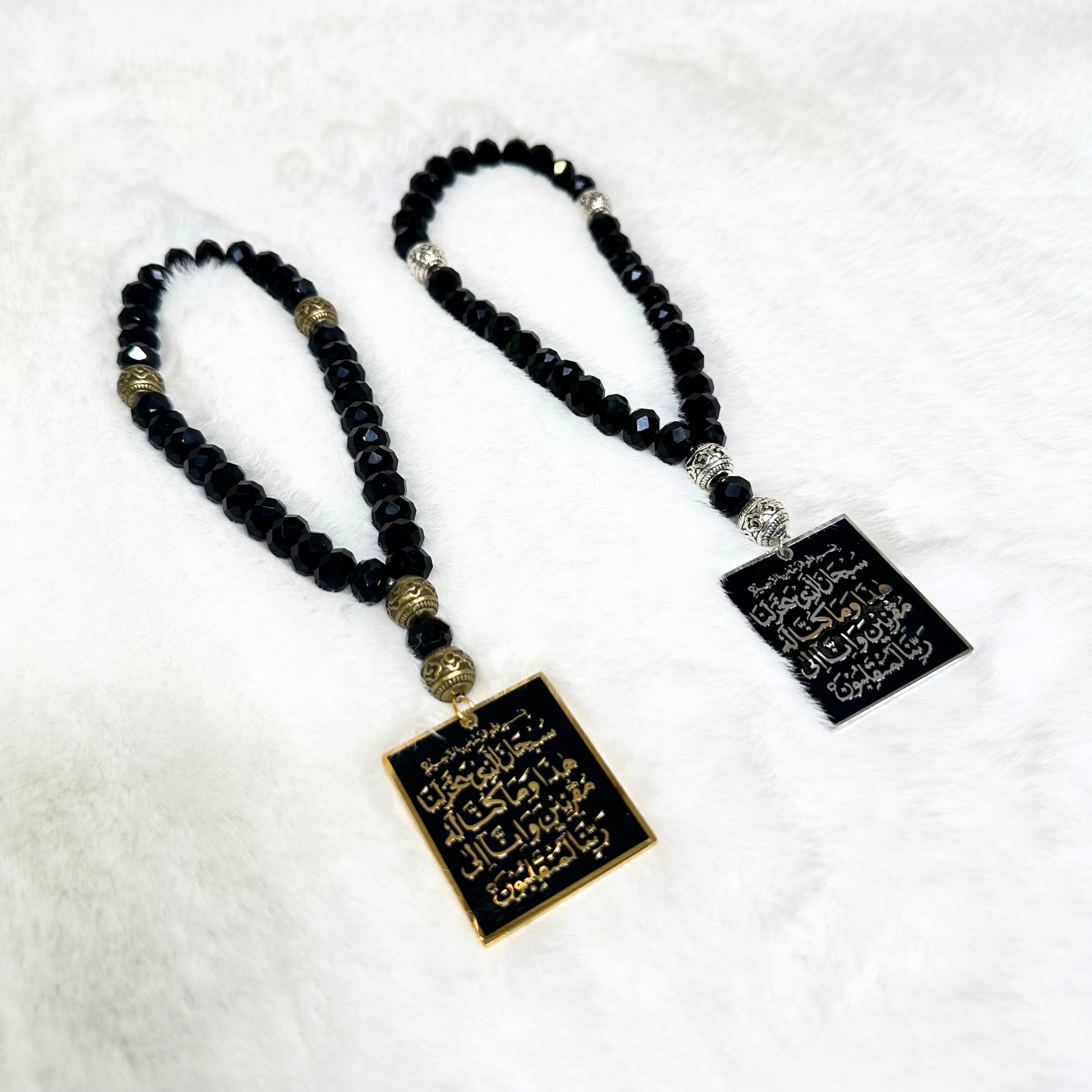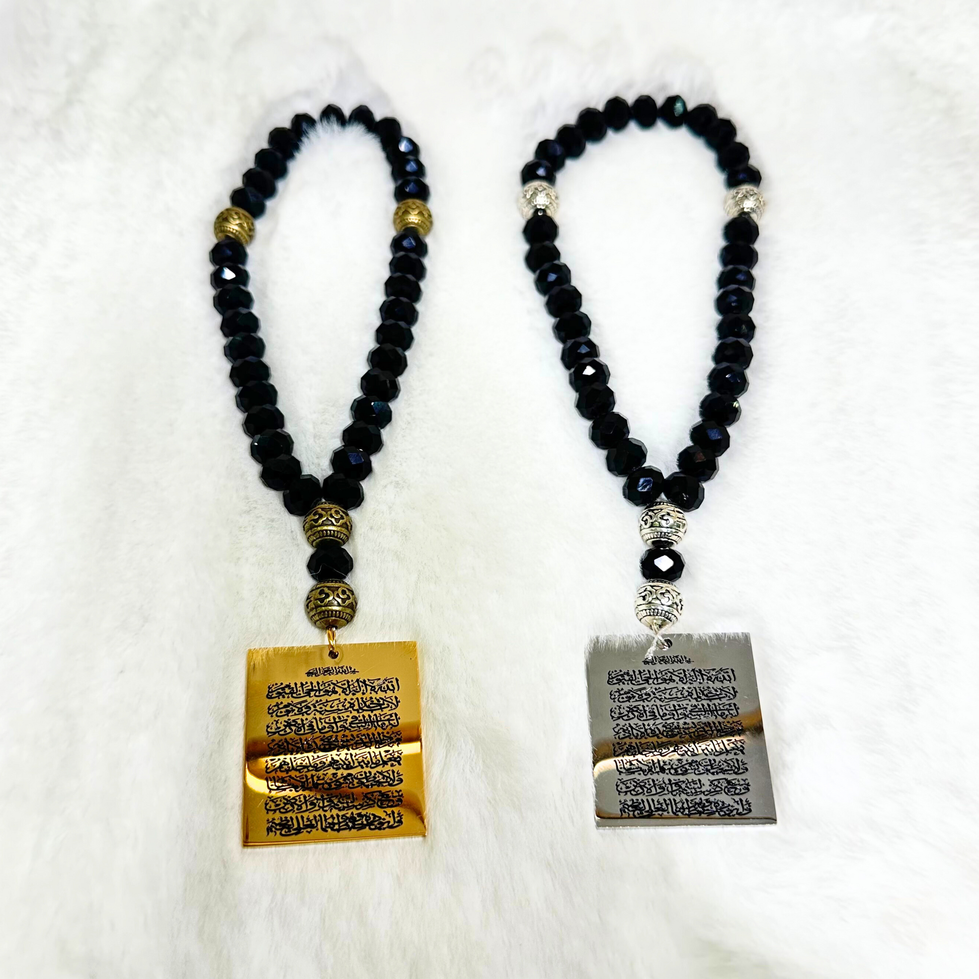Elevate your car interior with this exquisite 2-piece pendant set, featuring both a Gold & Black and a Silver & Black car pendant. Designed for those who seek beauty, meaning, and spiritual protection, each piece ensures Allah’s blessings accompany you on every journey.