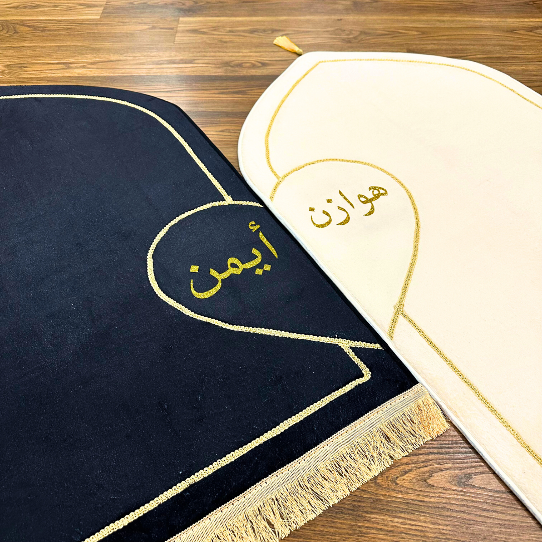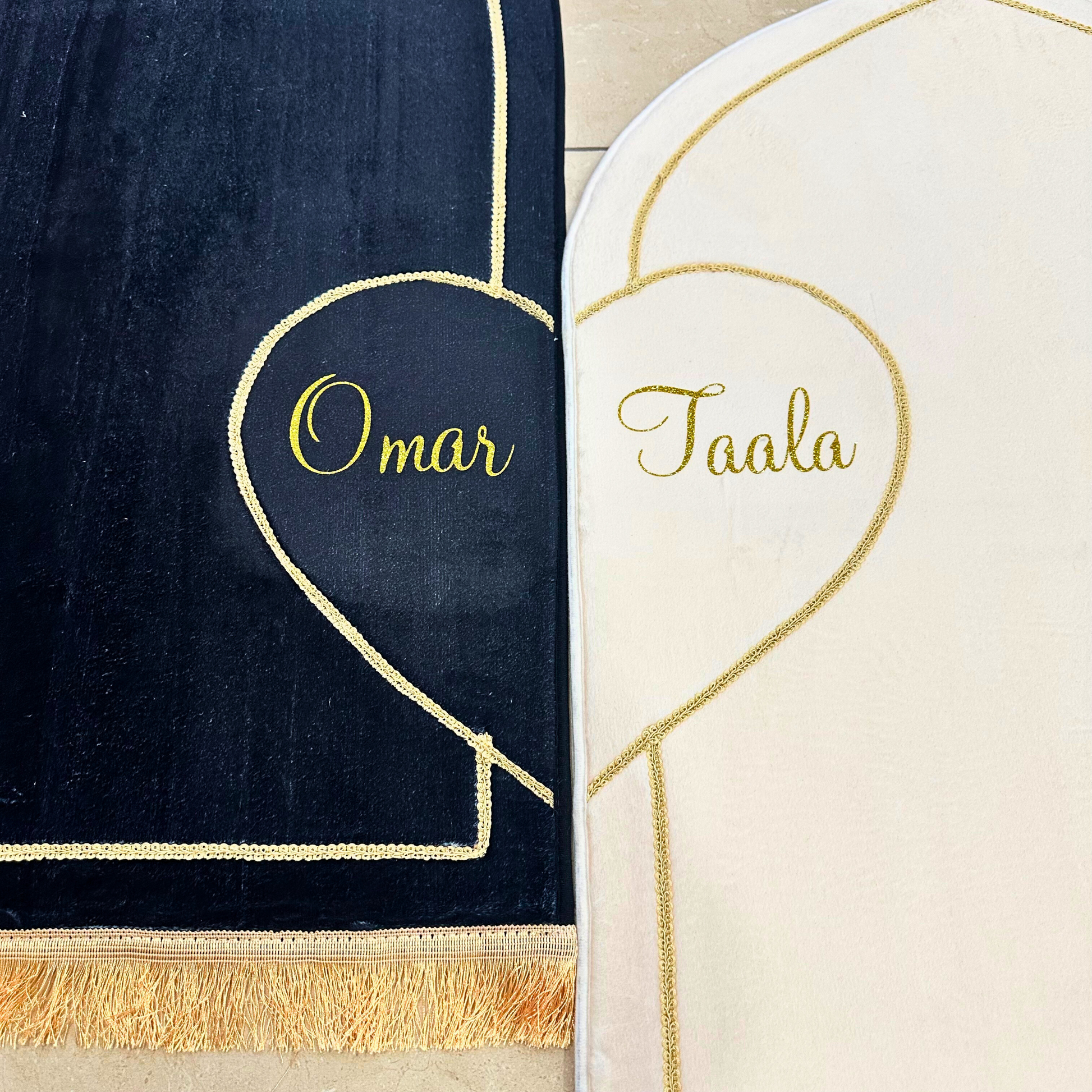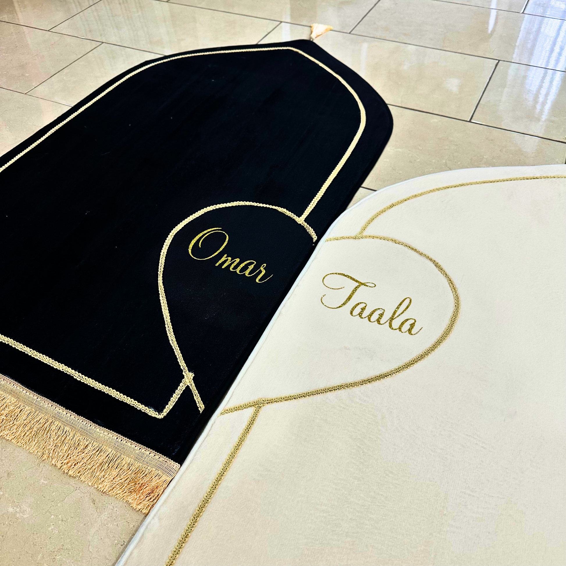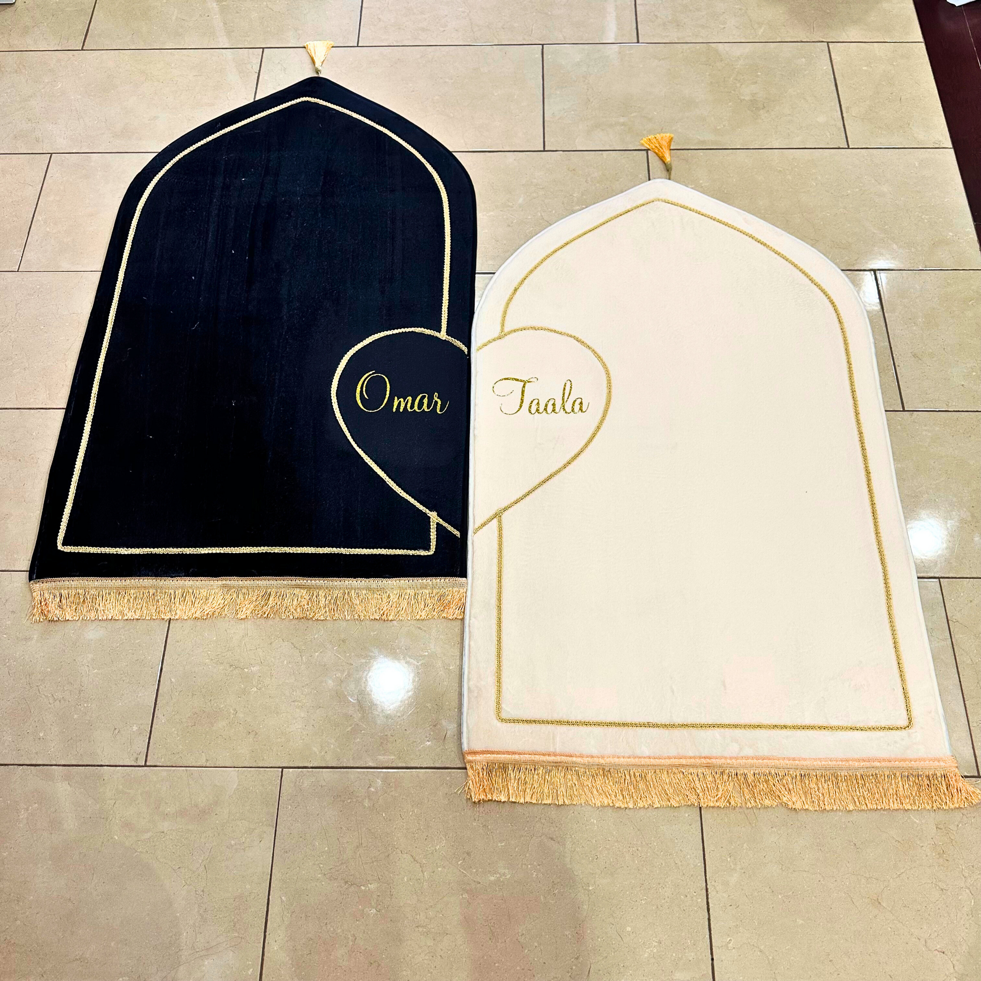 Celebrate a love rooted in faith with our signature Couples Prayer Mat Set—featuring two elegant mosque-shaped mats that gently connect at the heart ❤️. One in rich black, the other in soft off-white—each personalized with your names in gold or silver thread, making it a timeless gift for couples who pray together, grow together, and love together.