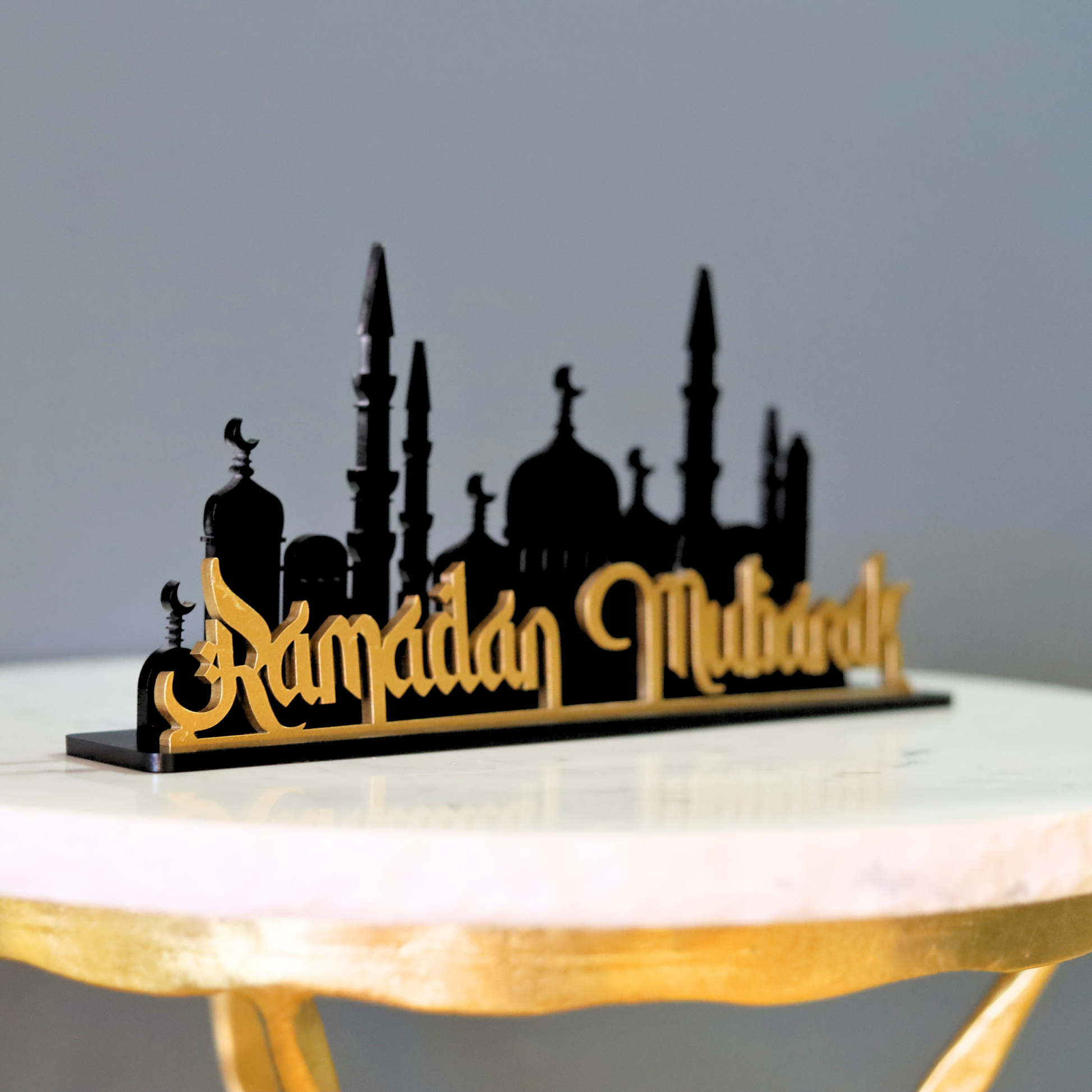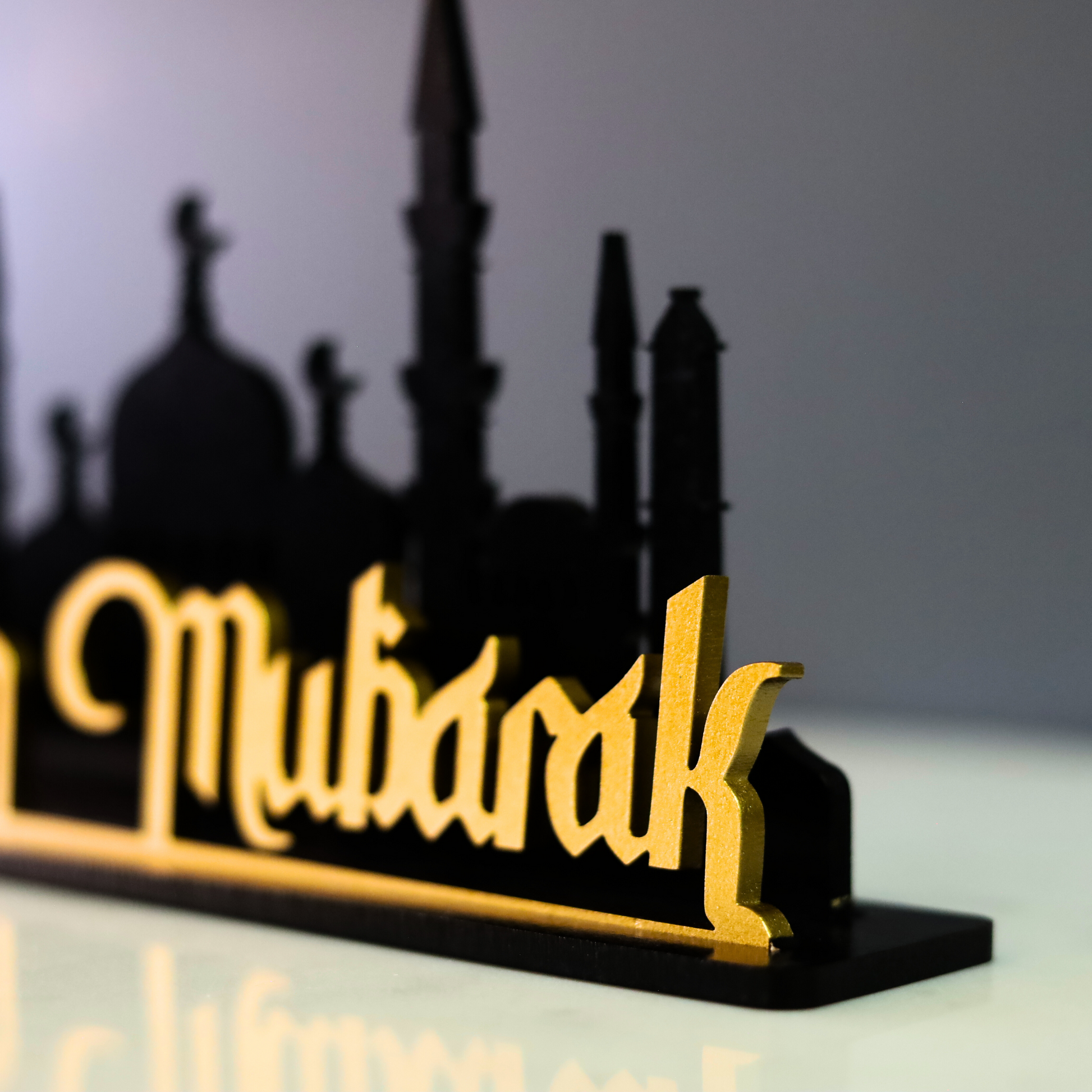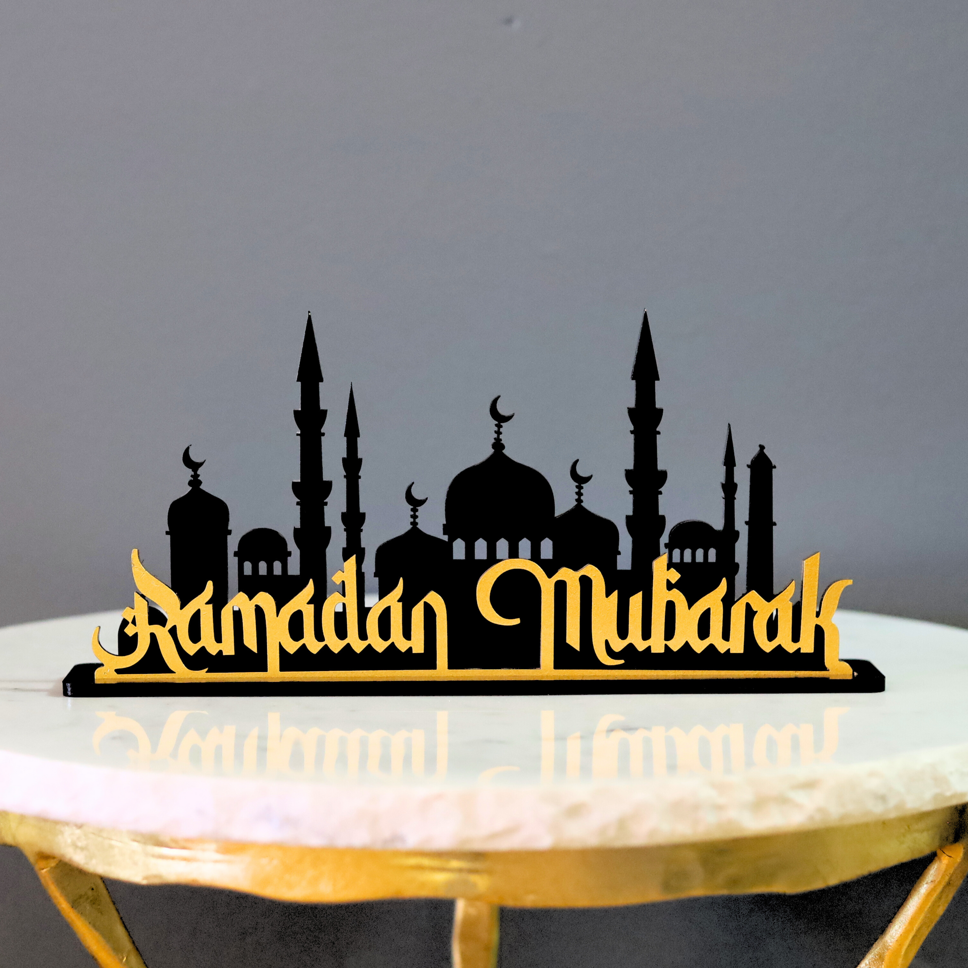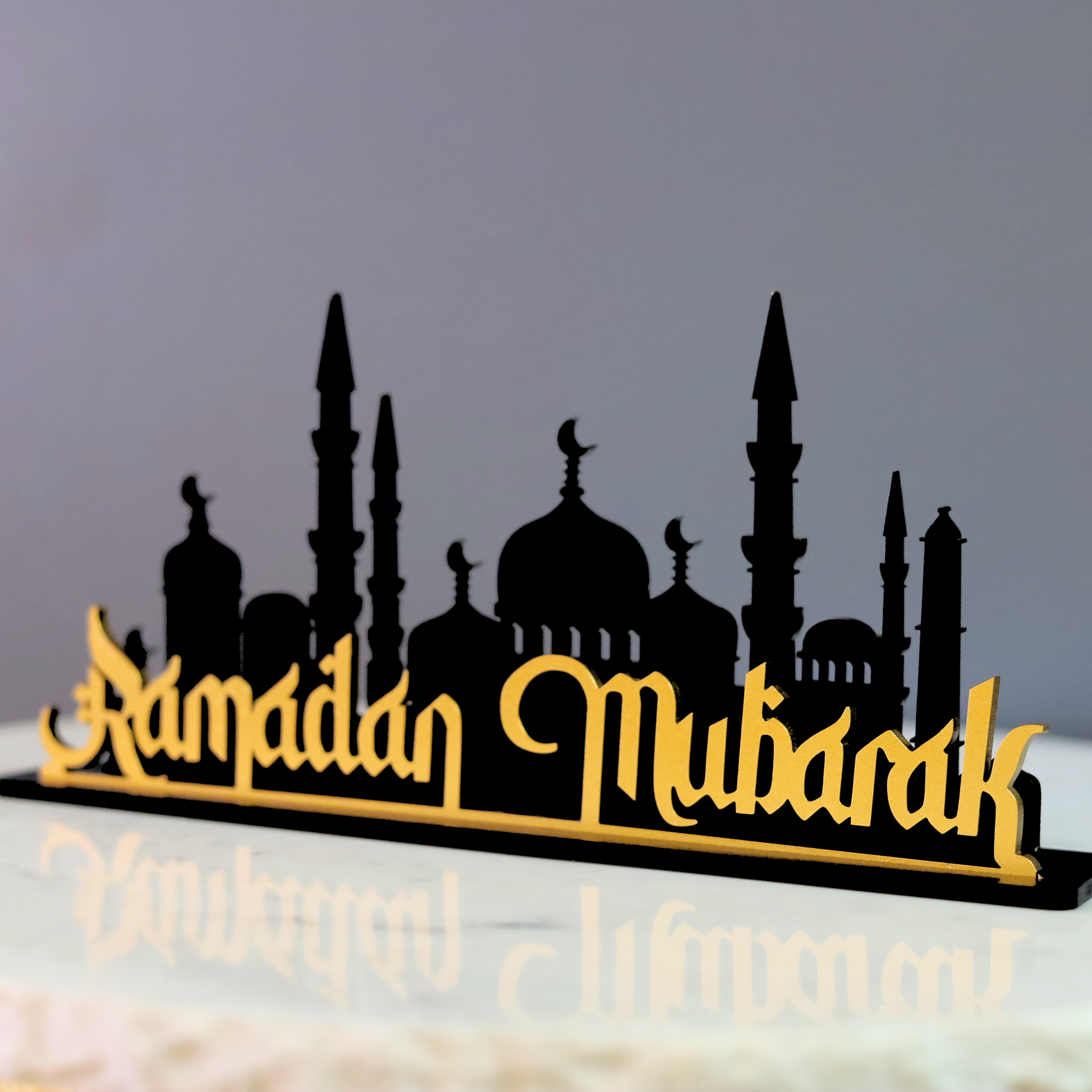 Bring the spirit of Ramadan into your home with this elegant table decor, designed to inspire and uplift. Featuring the phrase "Ramadan Mubarak" in stunning calligraphy at the front and a beautifully detailed mosque silhouette in the background, this decor piece serves as a meaningful reminder of the blessings of the holy month. Mounted on a sturdy plaque, it stands upright, making it a perfect centerpiece for your Ramadan celebrations.