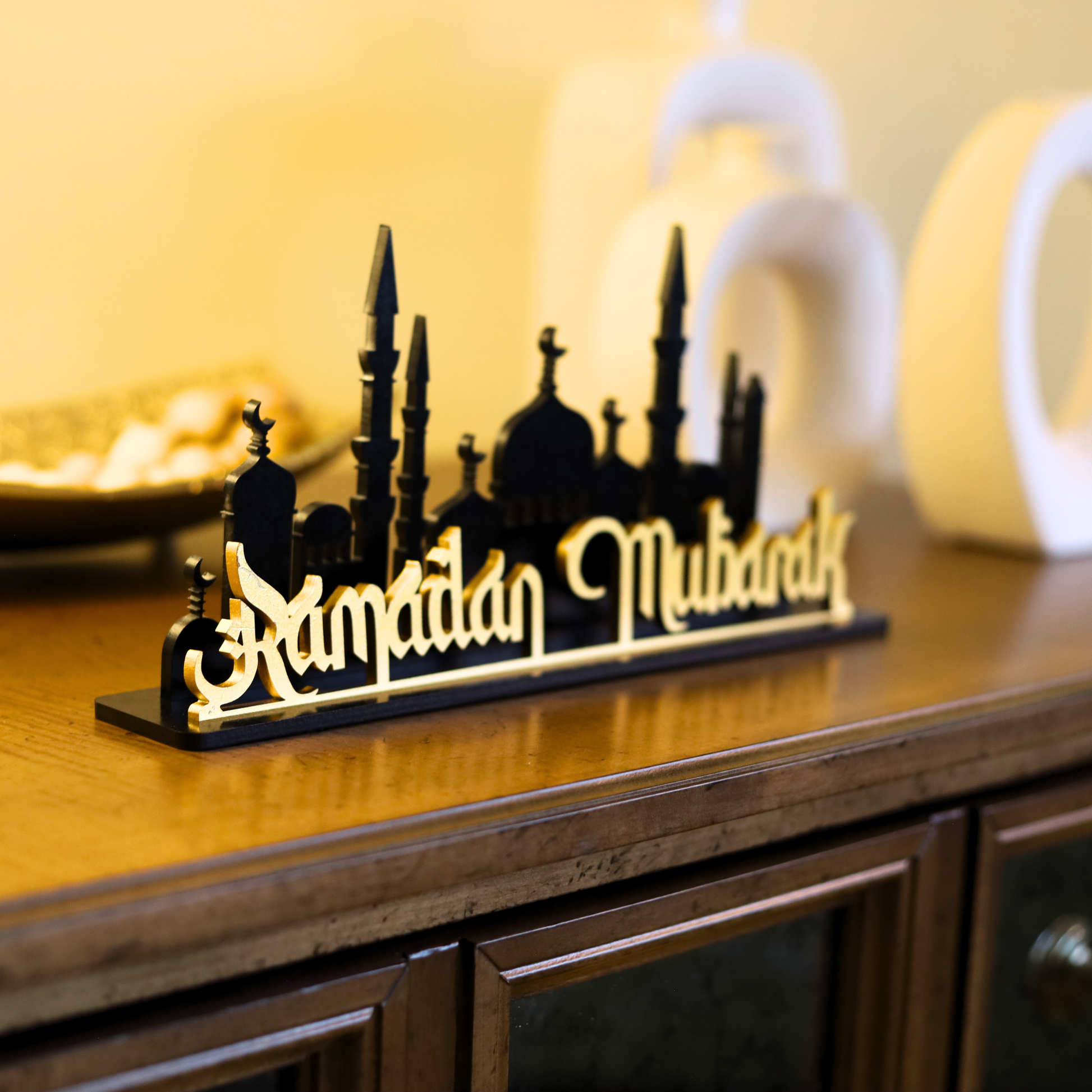 Crafted from high-quality black and gold MDF wood, this piece combines durability with timeless beauty. Its intricate design and premium craftsmanship reflect the elegance and importance of Ramadan, making it a standout addition to your home. Measuring 30cm x 13cm x 4cm, it’s perfectly sized to enhance your table, mantel, or any special space without overwhelming your decor.