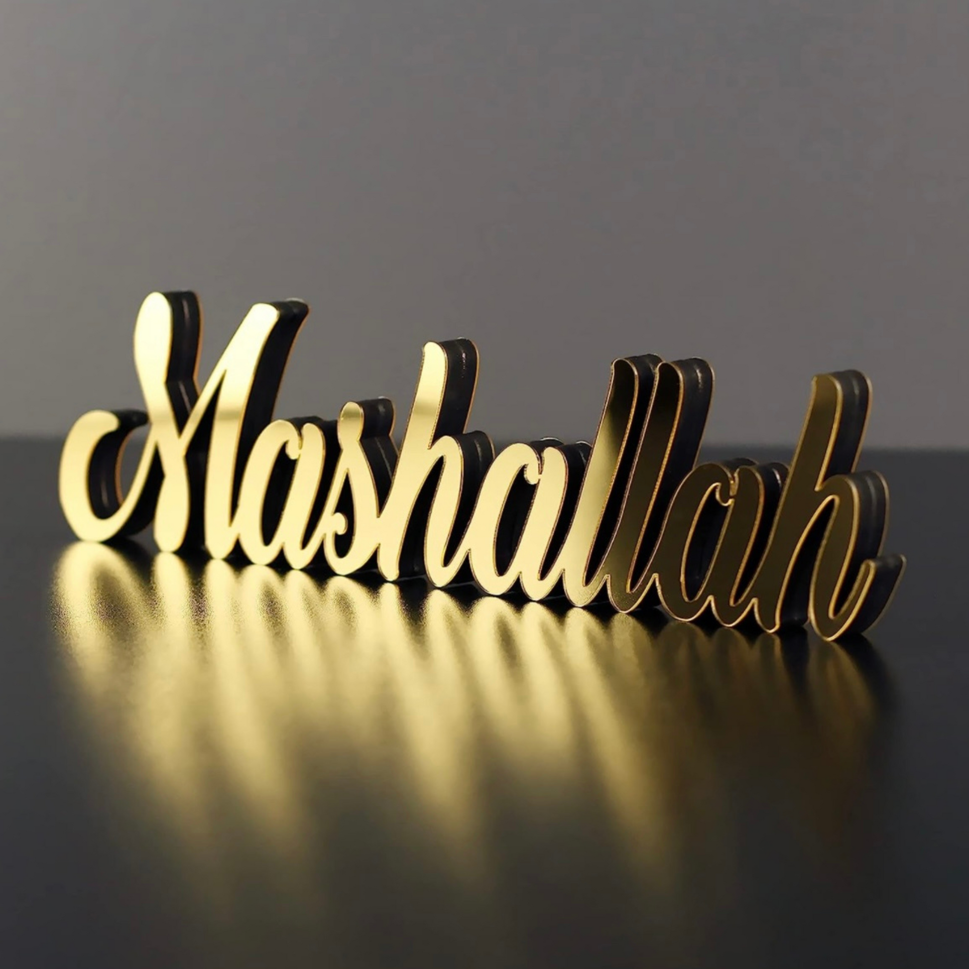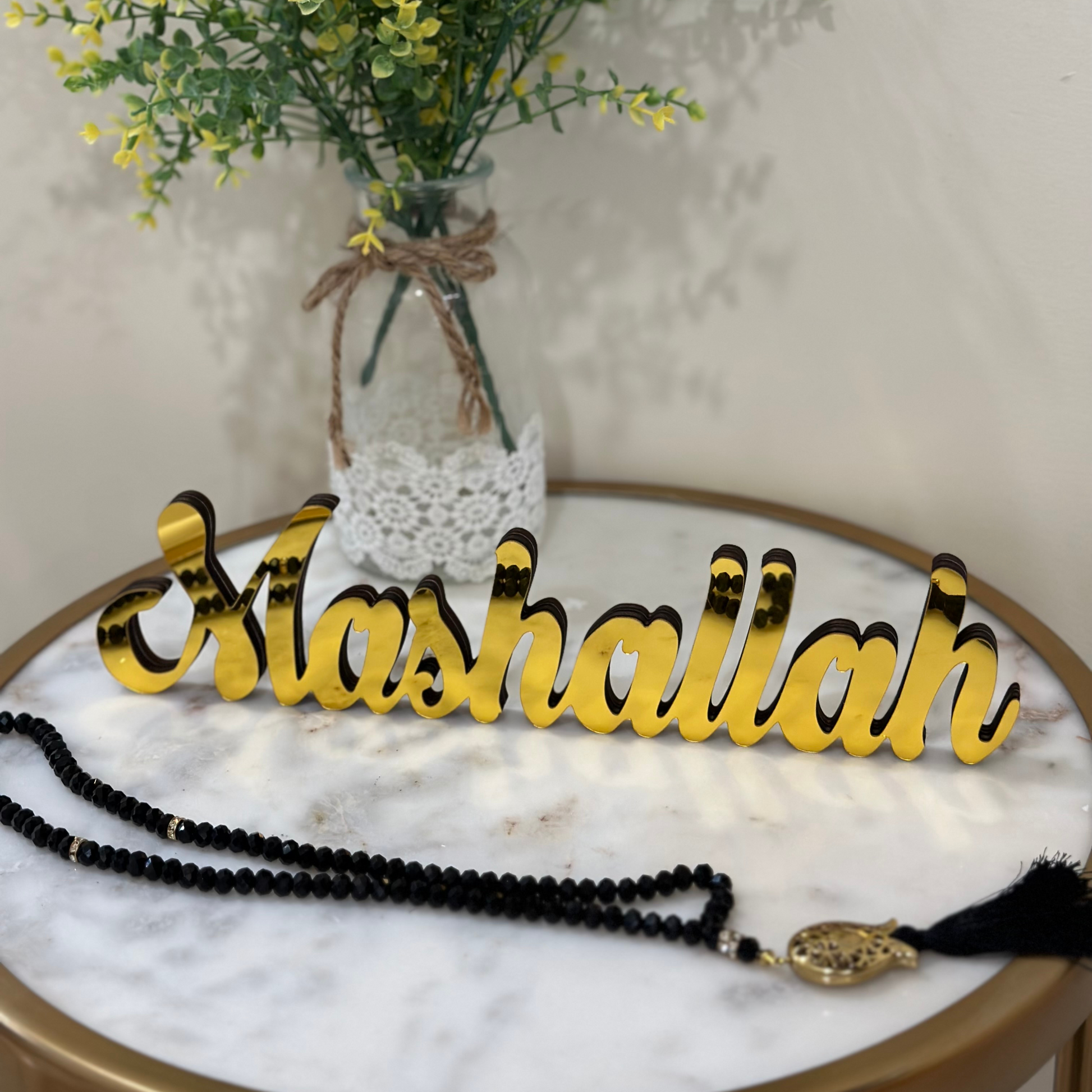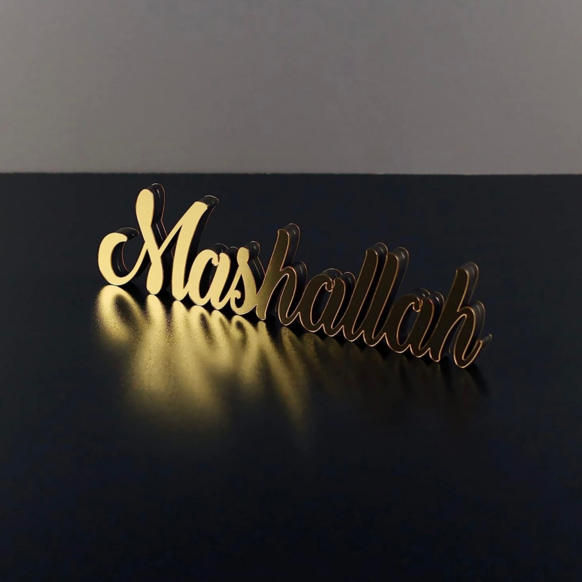 Celebrate the will of Allah ﷻ with this beautifully crafted Mashallah table decor, written in elegant English script. Cut from gold mirror acrylic on both sides and built around a thick wooden core, this piece brings a luxurious shine and solid presence to any space—small enough to fit anywhere, bold enough to leave an impression.