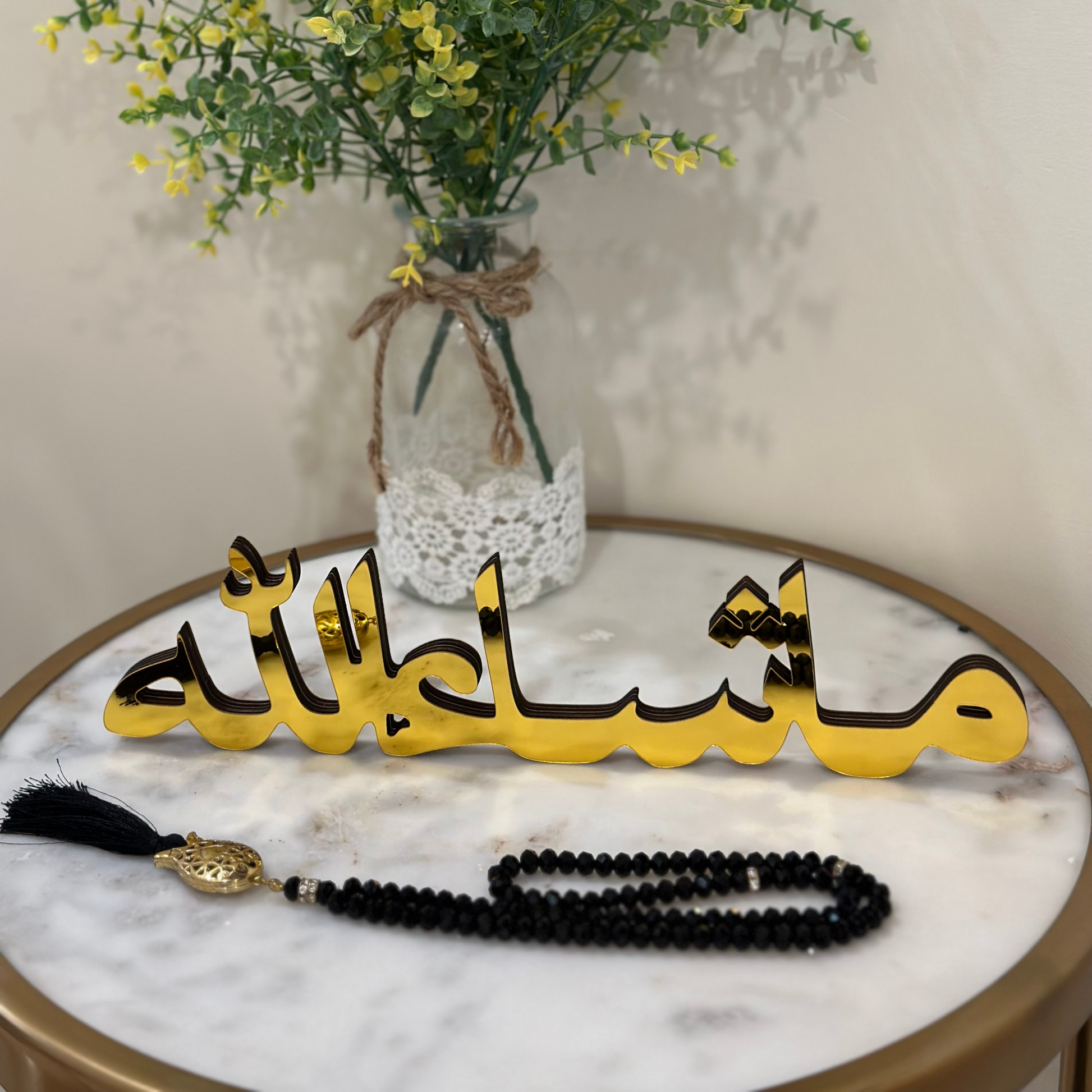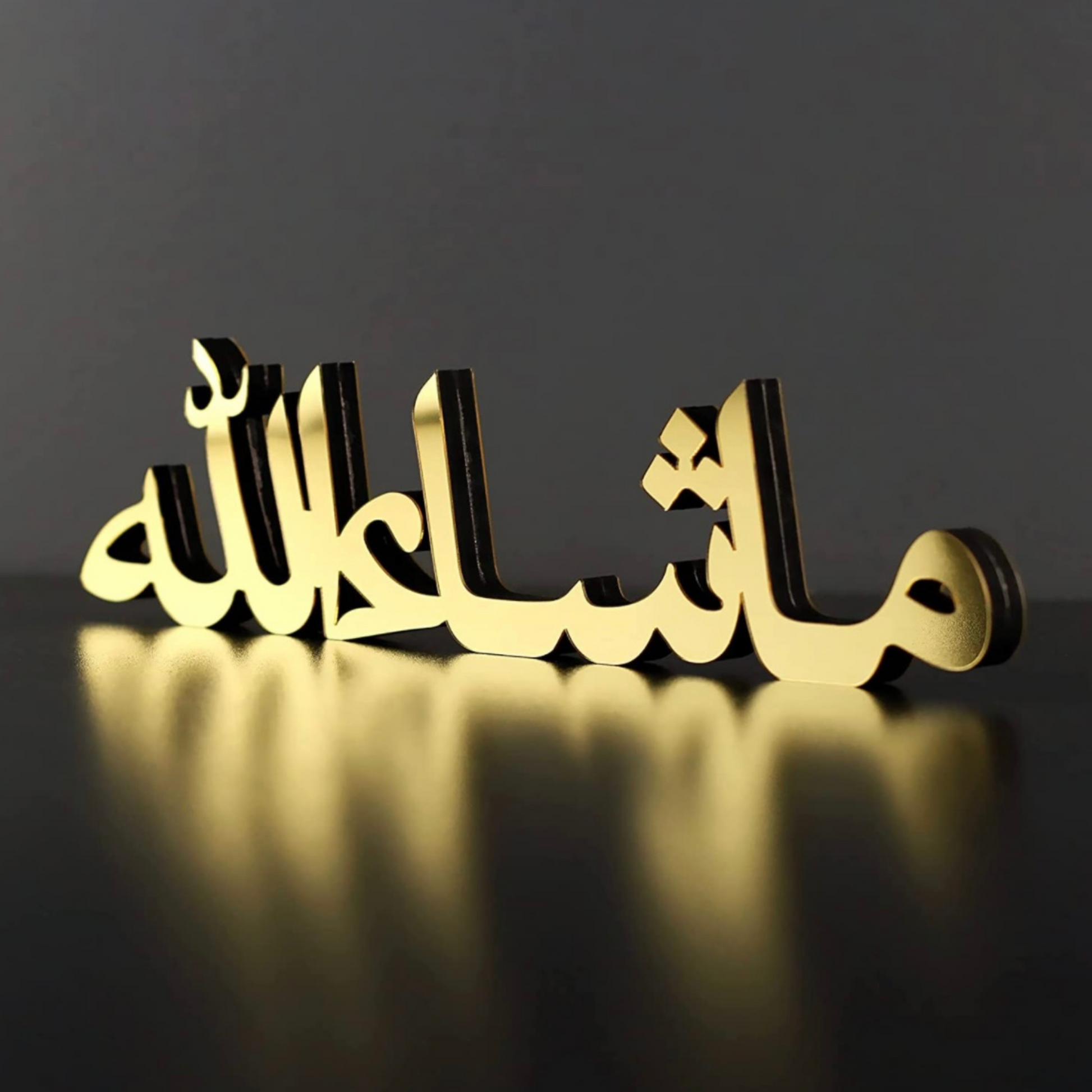 Celebrate what Allah has willed with this elegant “Mashallah” table decor—cut in graceful Arabic script and finished in gold mirror acrylic on both sides. Reinforced with thick, strong wood, this piece stands proudly on any surface, blending spiritual meaning with timeless beauty.