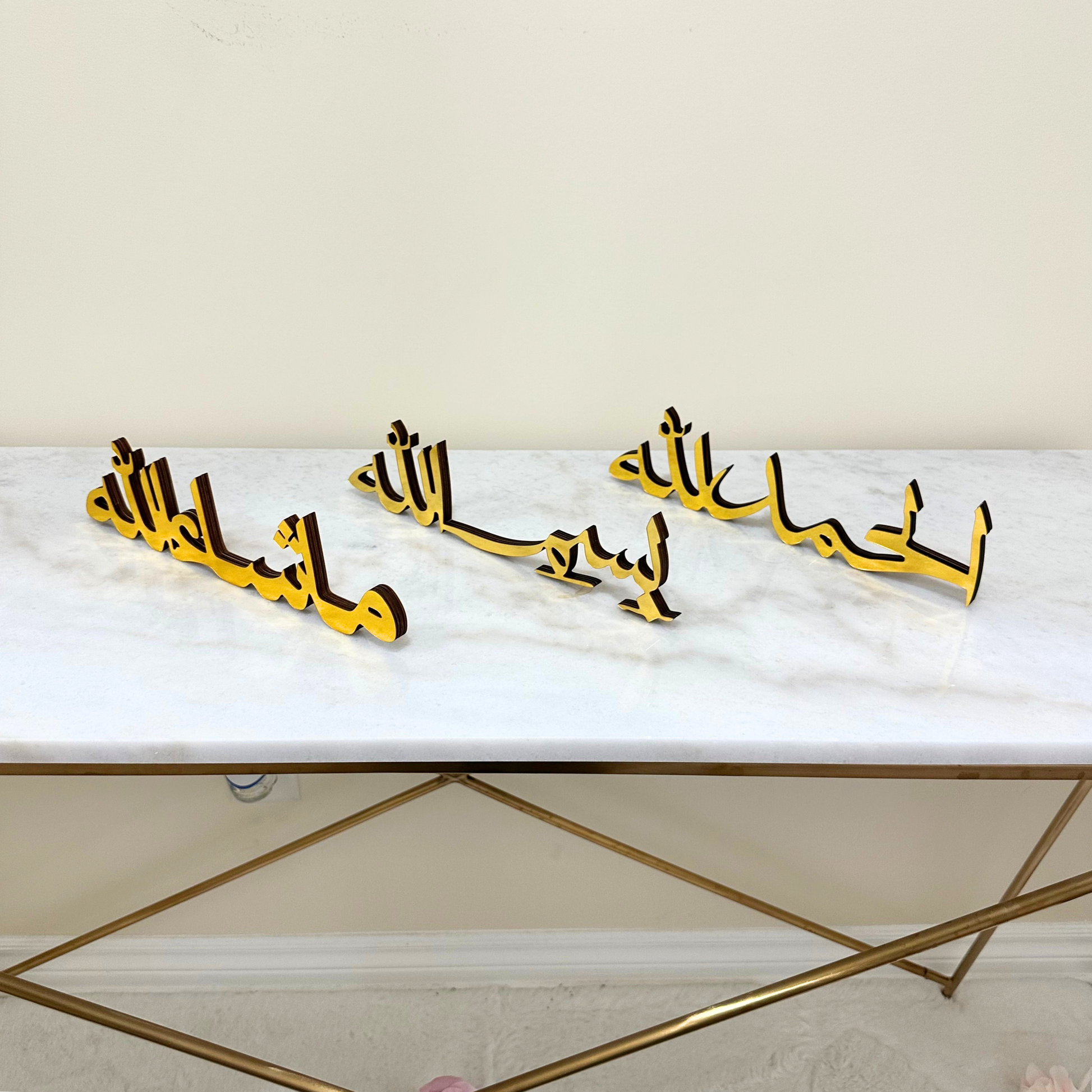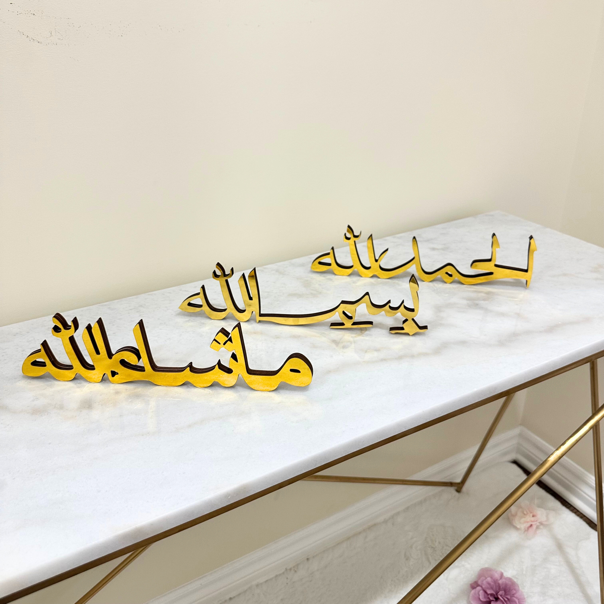 Stunning Gold Alhamdulillah, Bismillah, Mashallah Calligraphy Table Pieces Set of 3