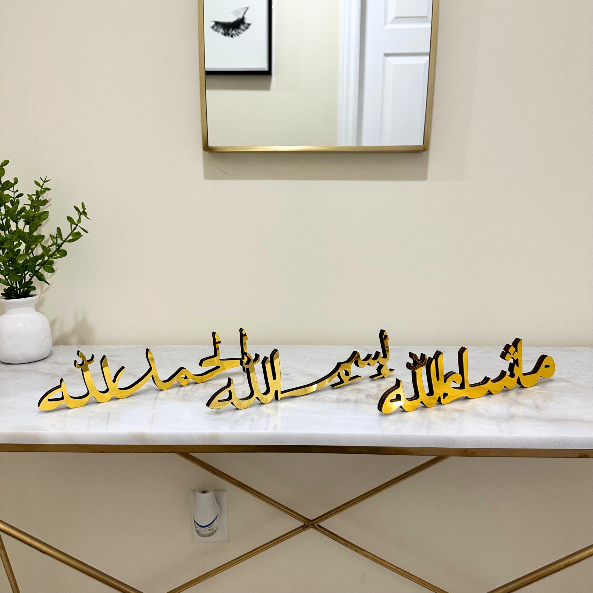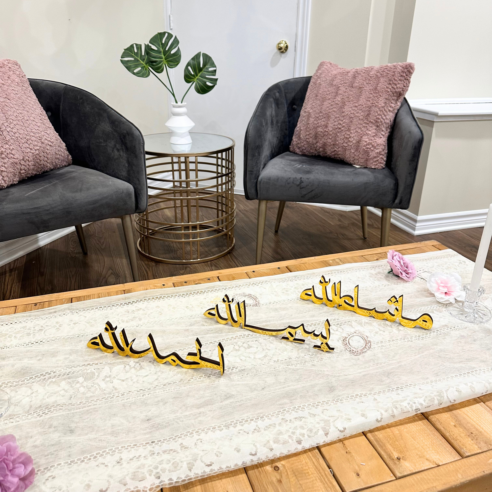 • Includes: 3 individual standing pieces: Alhamdulillah, Bismillah, and Mashallah