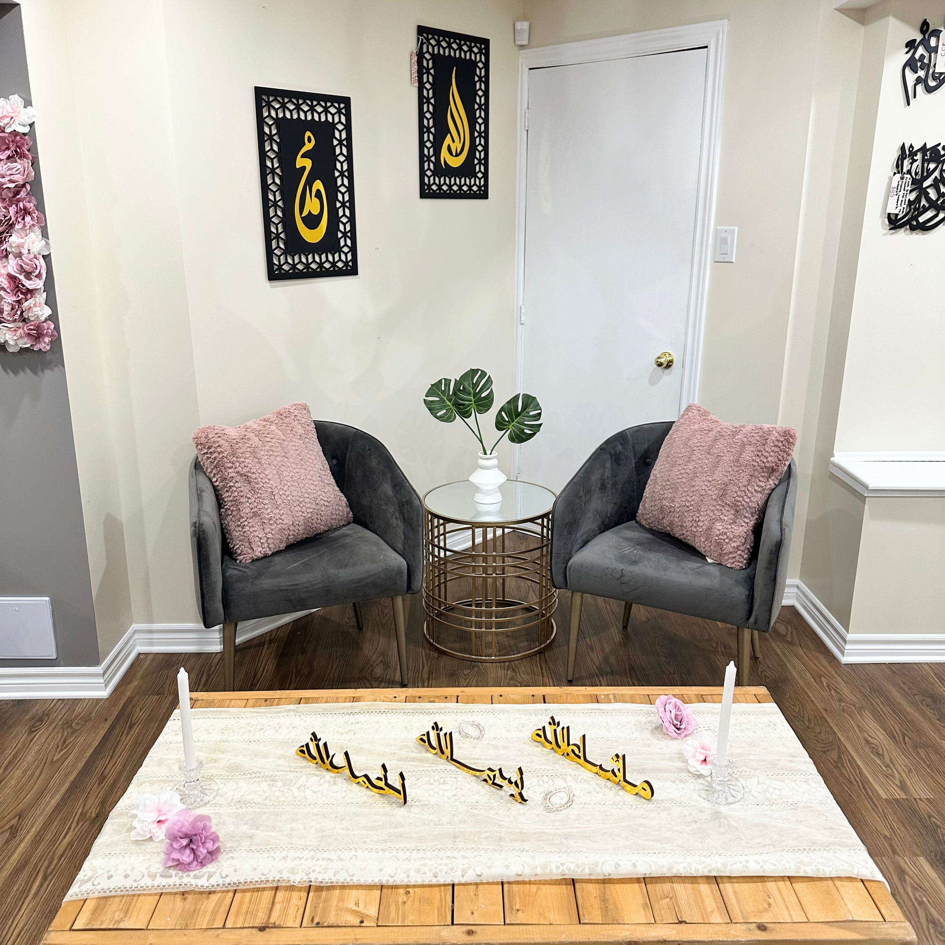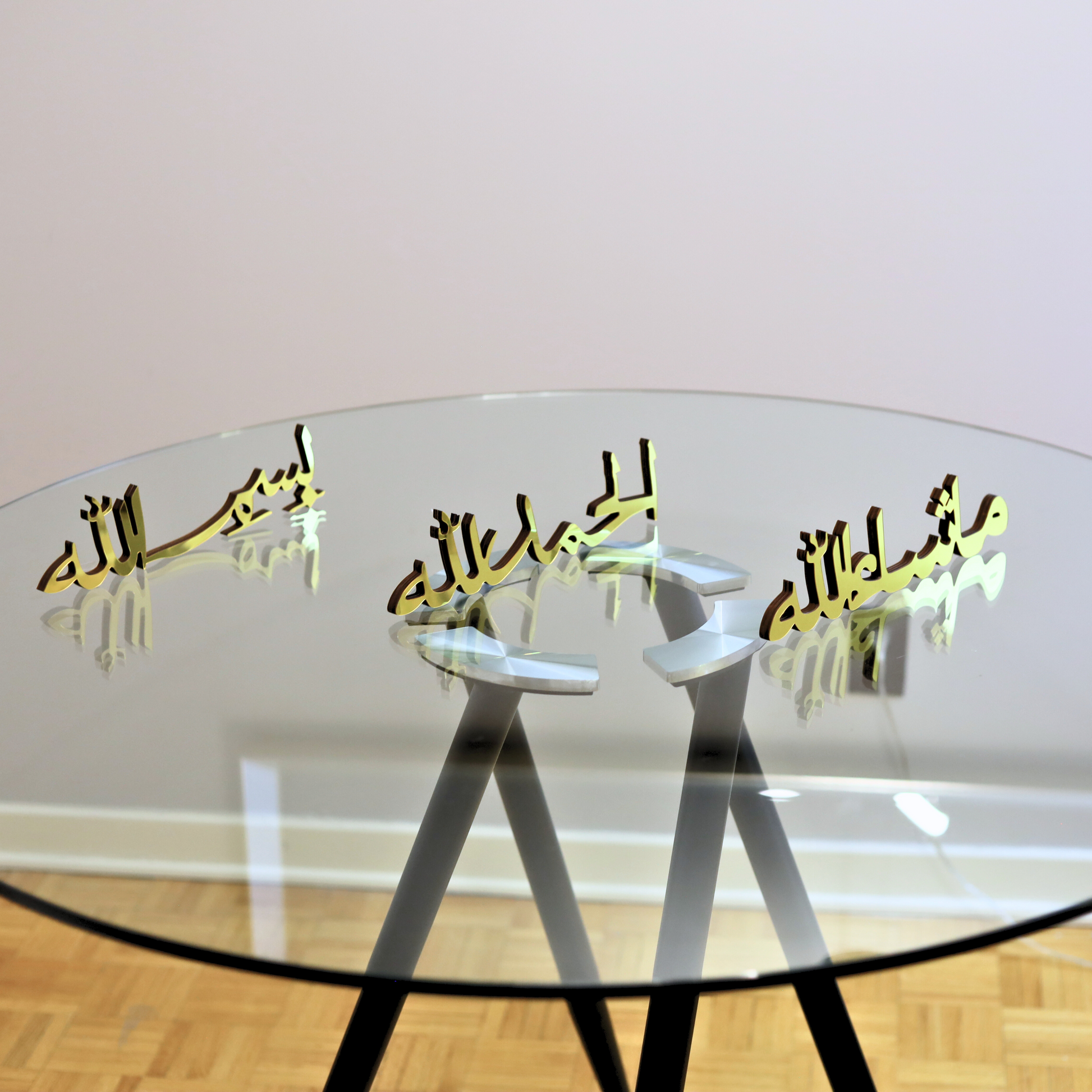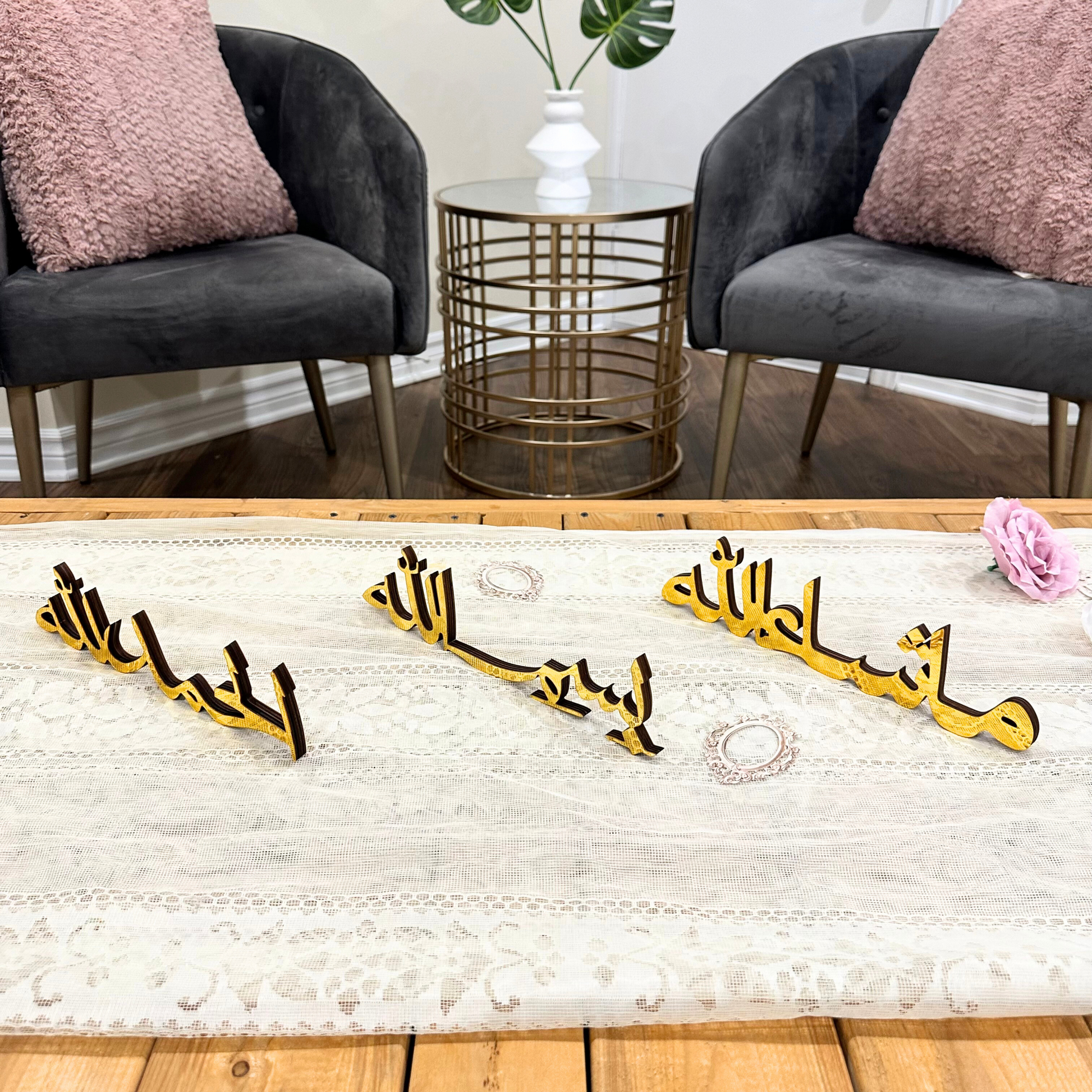 Infuse your space with beauty and barakah through this stunning 3-piece table decor set, featuring three beloved phrases in Arabic calligraphy: