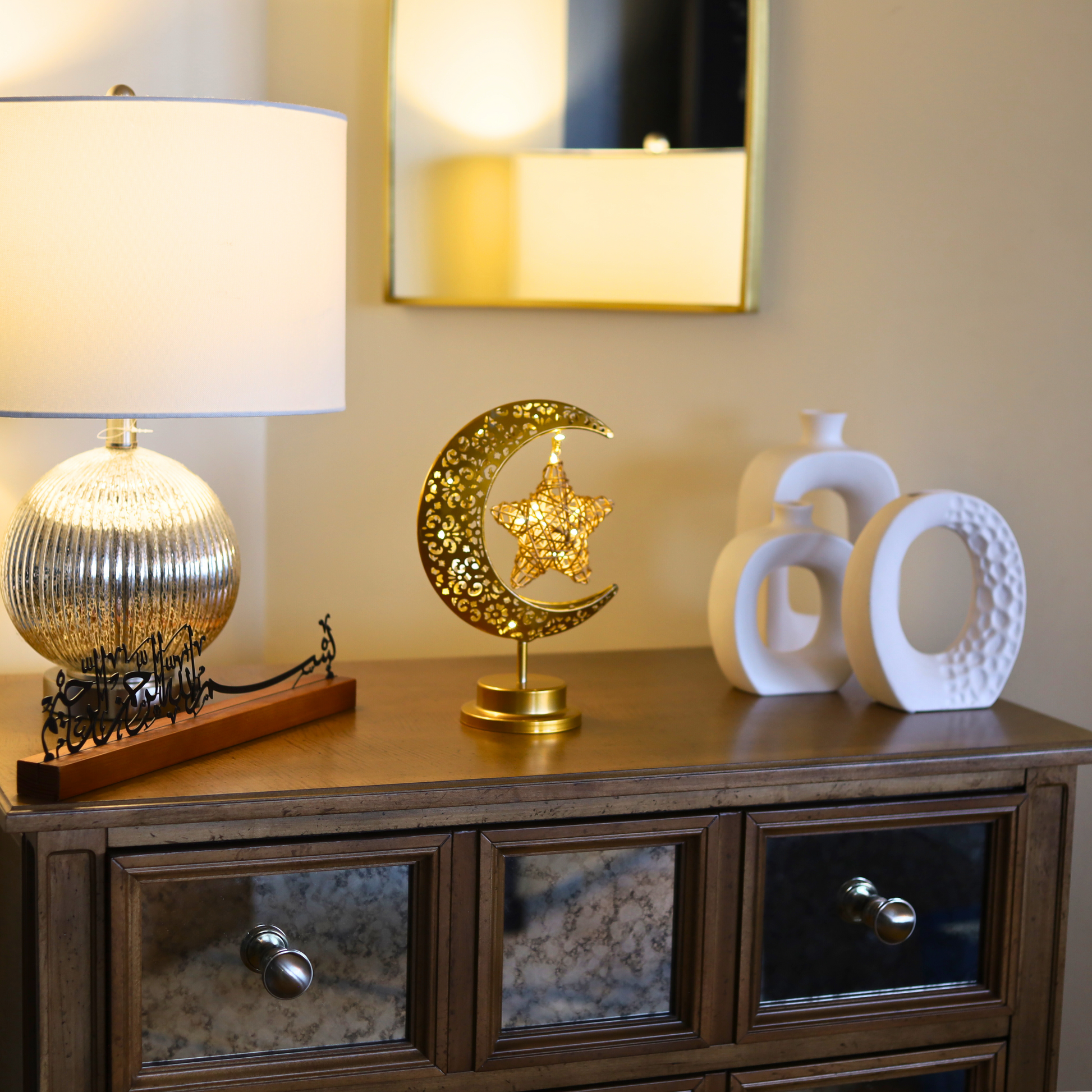 Illuminate your home with the charm and elegance of this Crescent Moon and Star Lamp, a perfect addition to your Ramadan and Eid decor. Designed with intricate detail, the golden crescent and beautifully dangling star are filled with soft LED lights, casting a warm, inviting glow that embodies the spirit of the holy month.