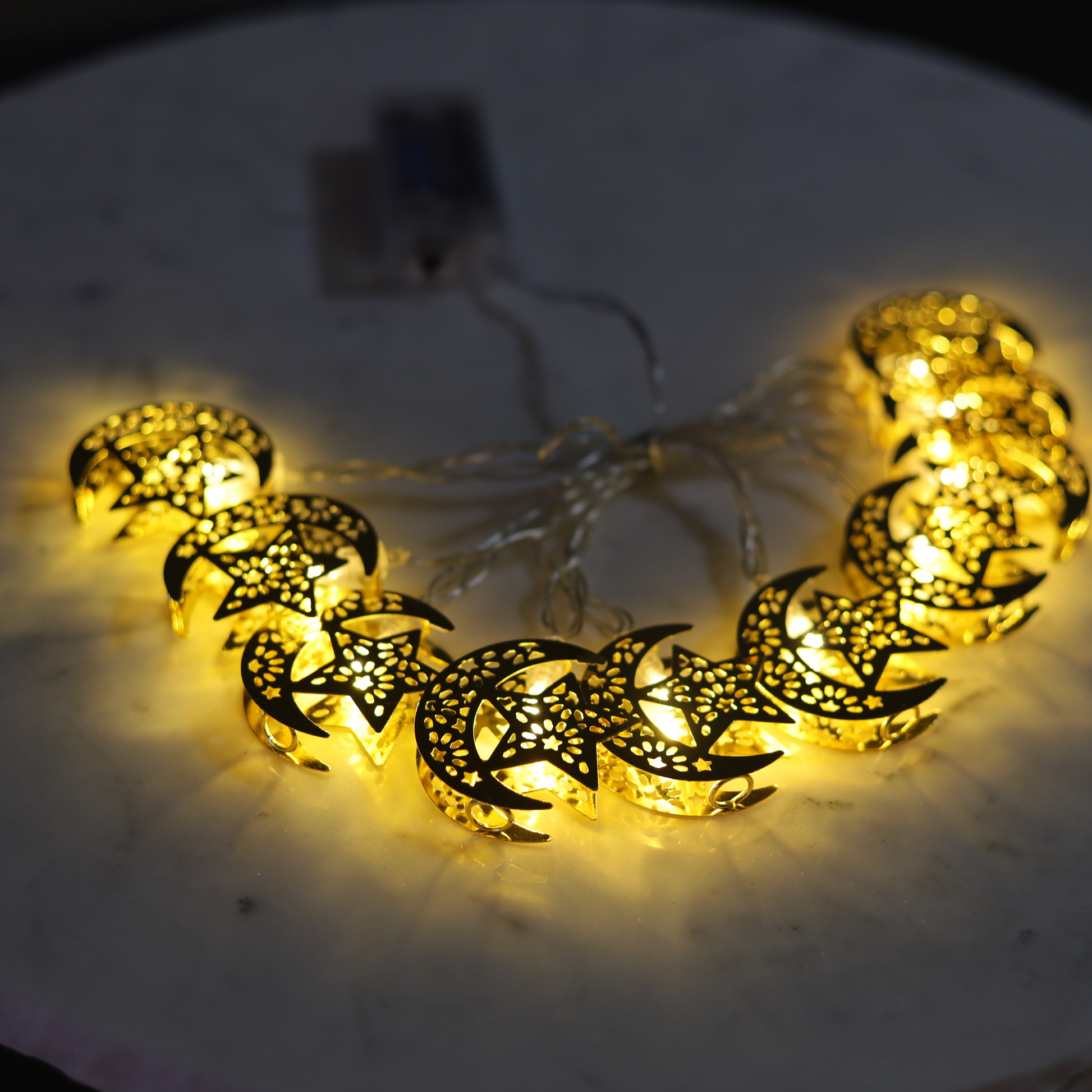 - Material: Golden Metal Crescent Moon & Star-Shaped Bulbs