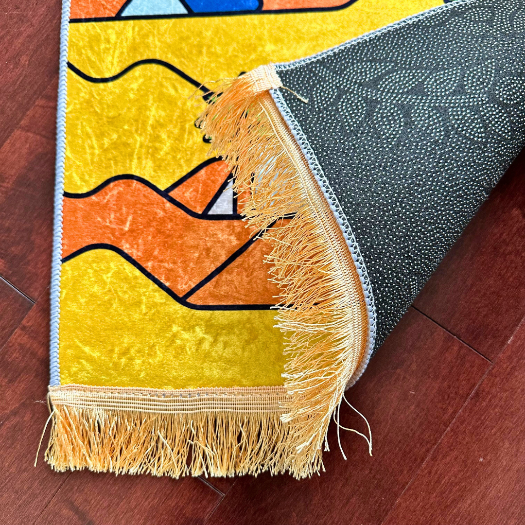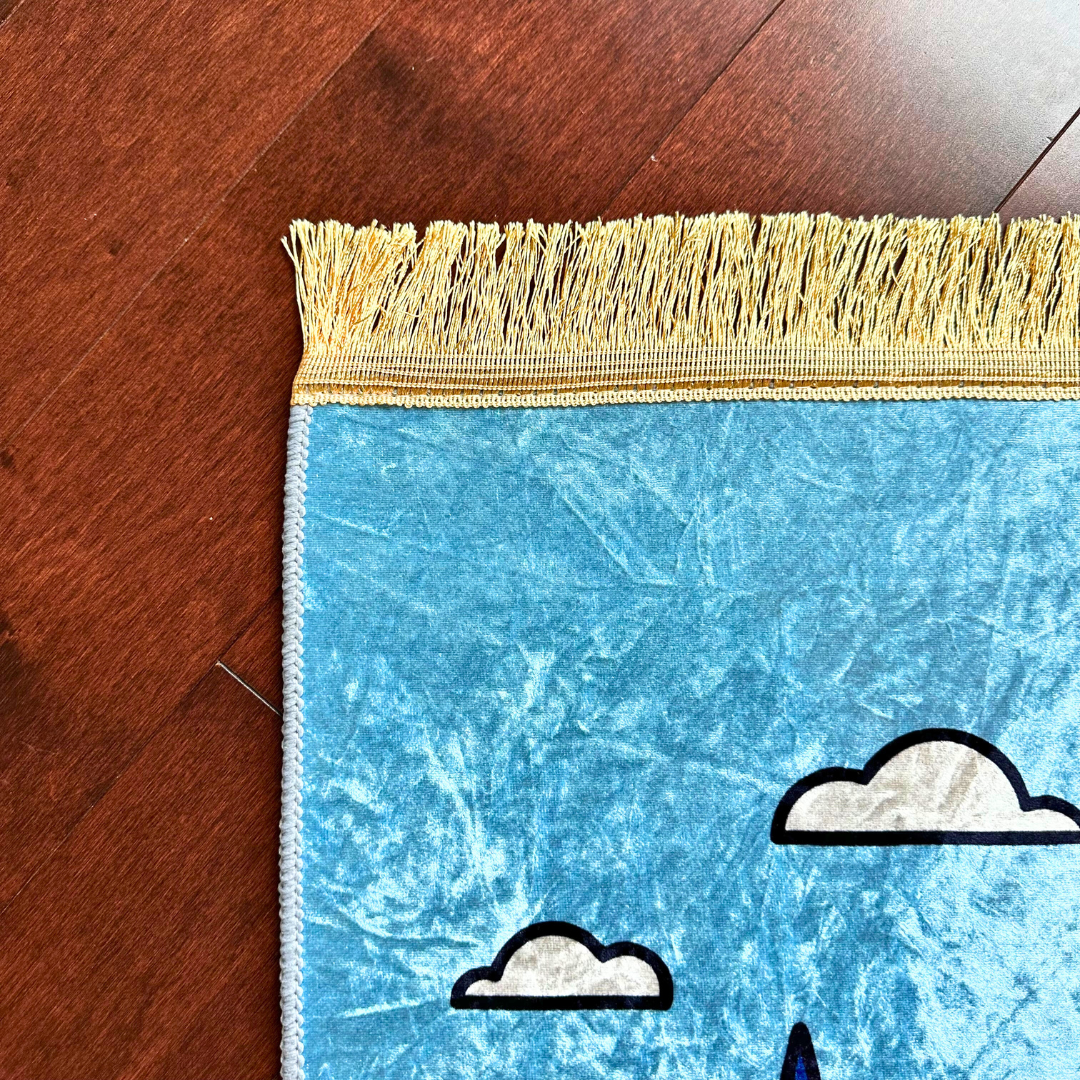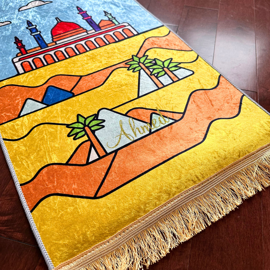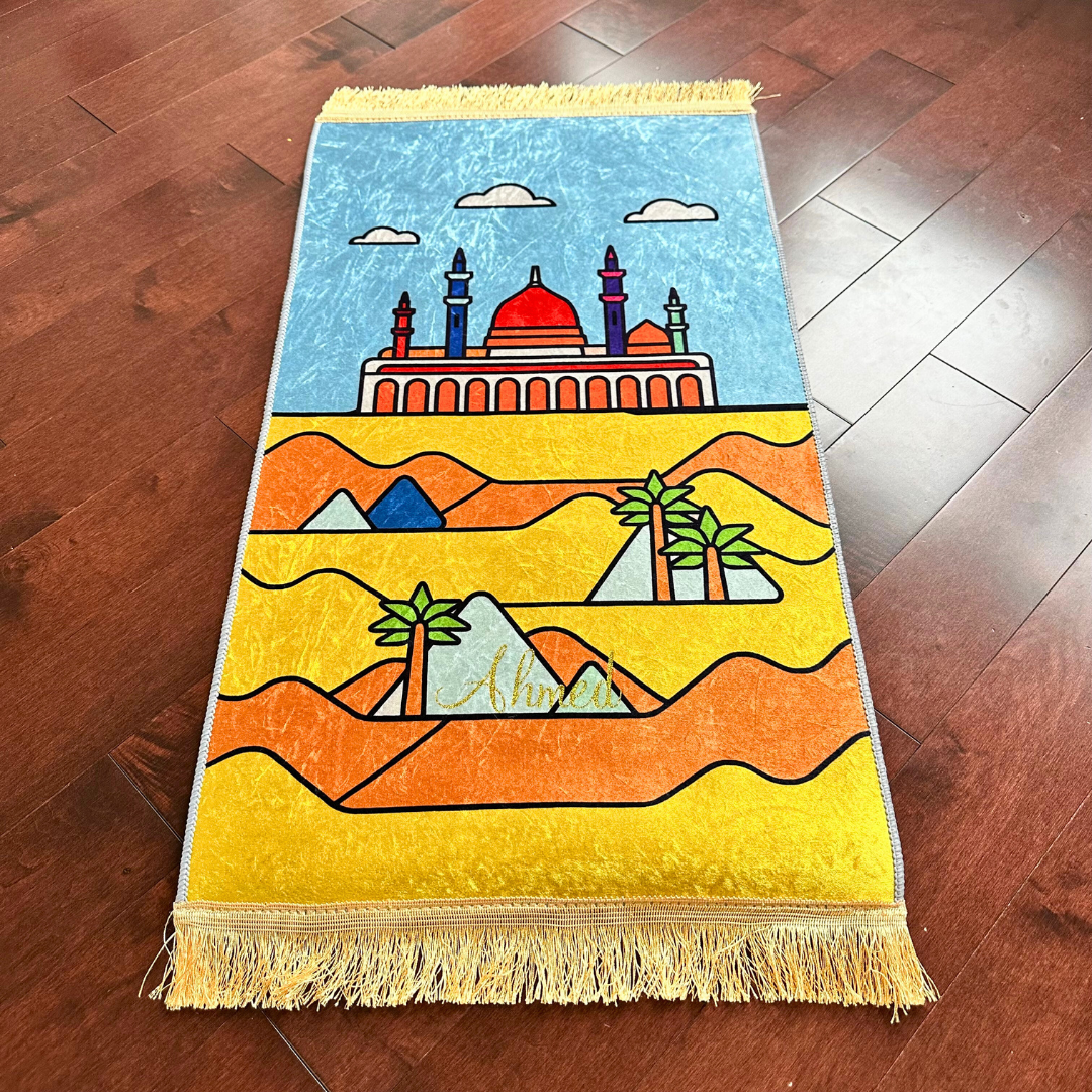 Featuring a colorful desert scene with soft hills, tall palm trees, and a glowing red-domed masjid, this mat invites your child to explore faith through imagination. It’s lightweight, easy to carry, and oh-so-soft—turning prayer into something he looks forward to every single day.