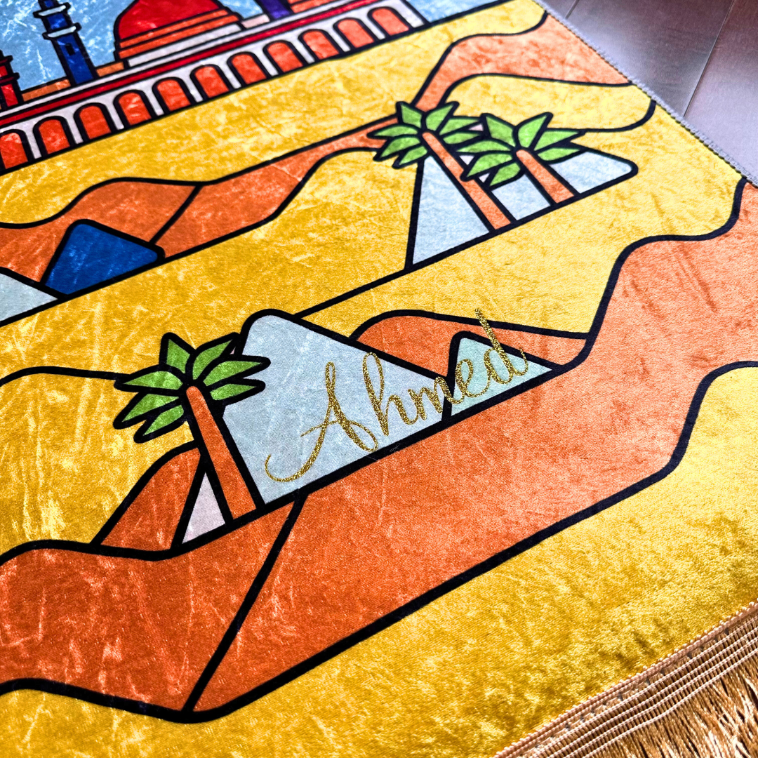 And the best part? His name is included—added in Gold or Silver heat vinyl —so it lasts forever, making every rak’ah feel like it was made just for him.
