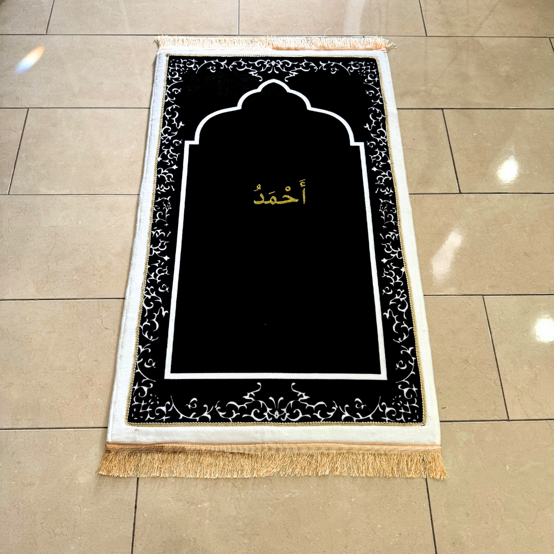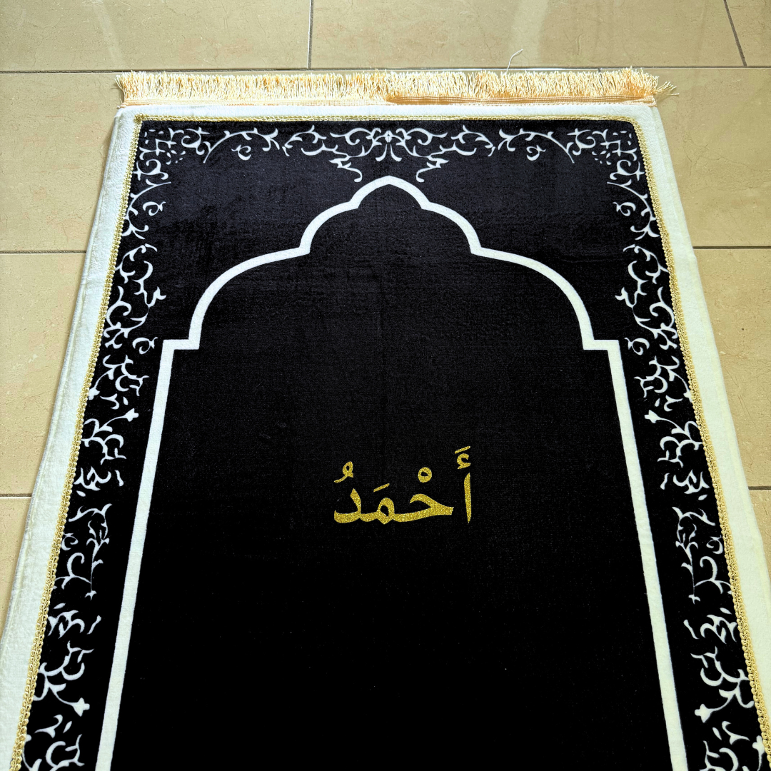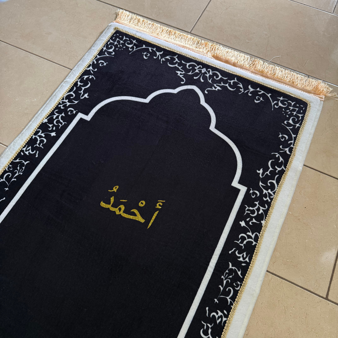 Made with cloud-soft flannel and 12 mm thick padding, it supports your body with every sujood. The deep black color, elegant gold trim, and mosque arch shape make it feel rich, timeless, and special. And to make it truly yours, your name is added in Gold or Silver heat vinyl—in any language you choose.