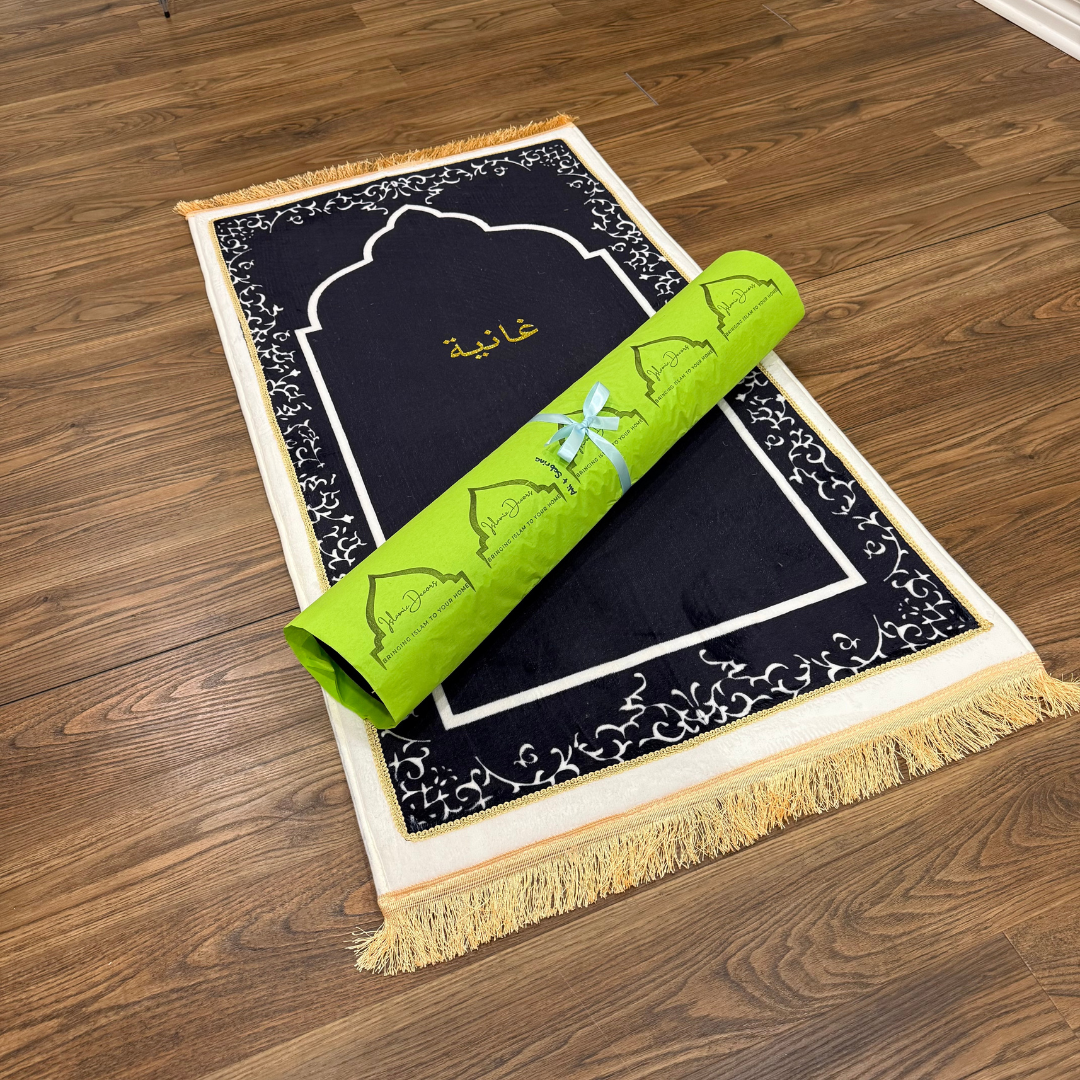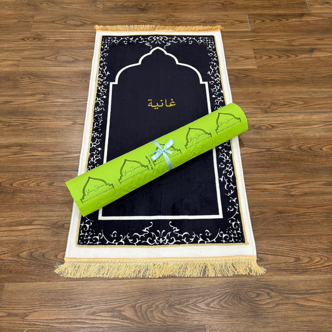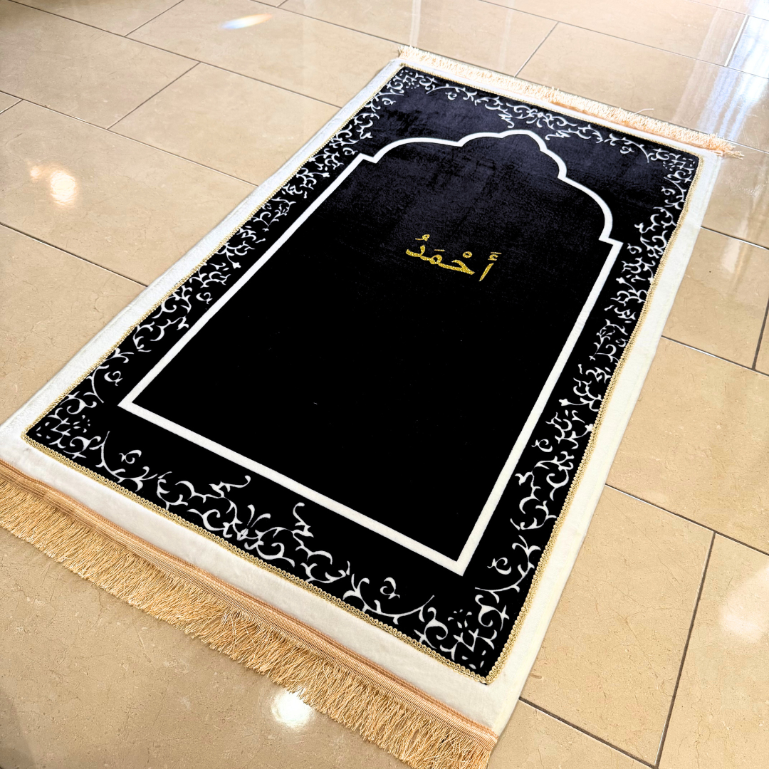 Made with cloud-soft flannel and 12 mm thick padding, it supports your body with every sujood. The deep black color, elegant gold trim, and mosque arch shape make it feel rich, timeless, and special. And to make it truly yours, your name is added in Gold or Silver heat vinyl—in any language you choose.