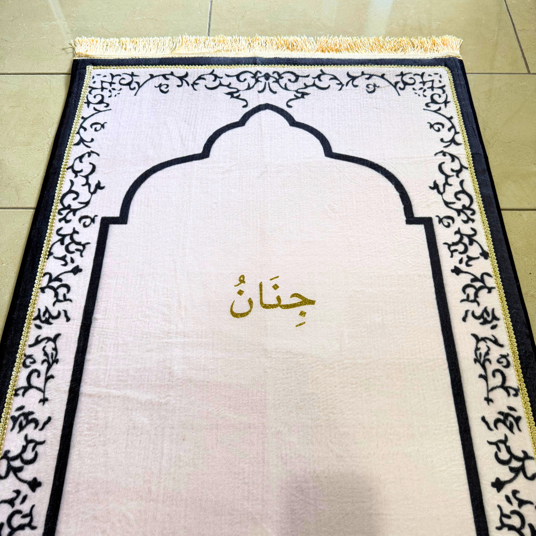 Made with extra-thick 12 mm flannel padding, this mat supports your knees and back gently, while the light pink, golden trim, and elegant mosque arch shape bring timeless beauty to your prayer space. And the best part? Your name is included—in Gold or Silver heat vinyl, written in any language you choose.