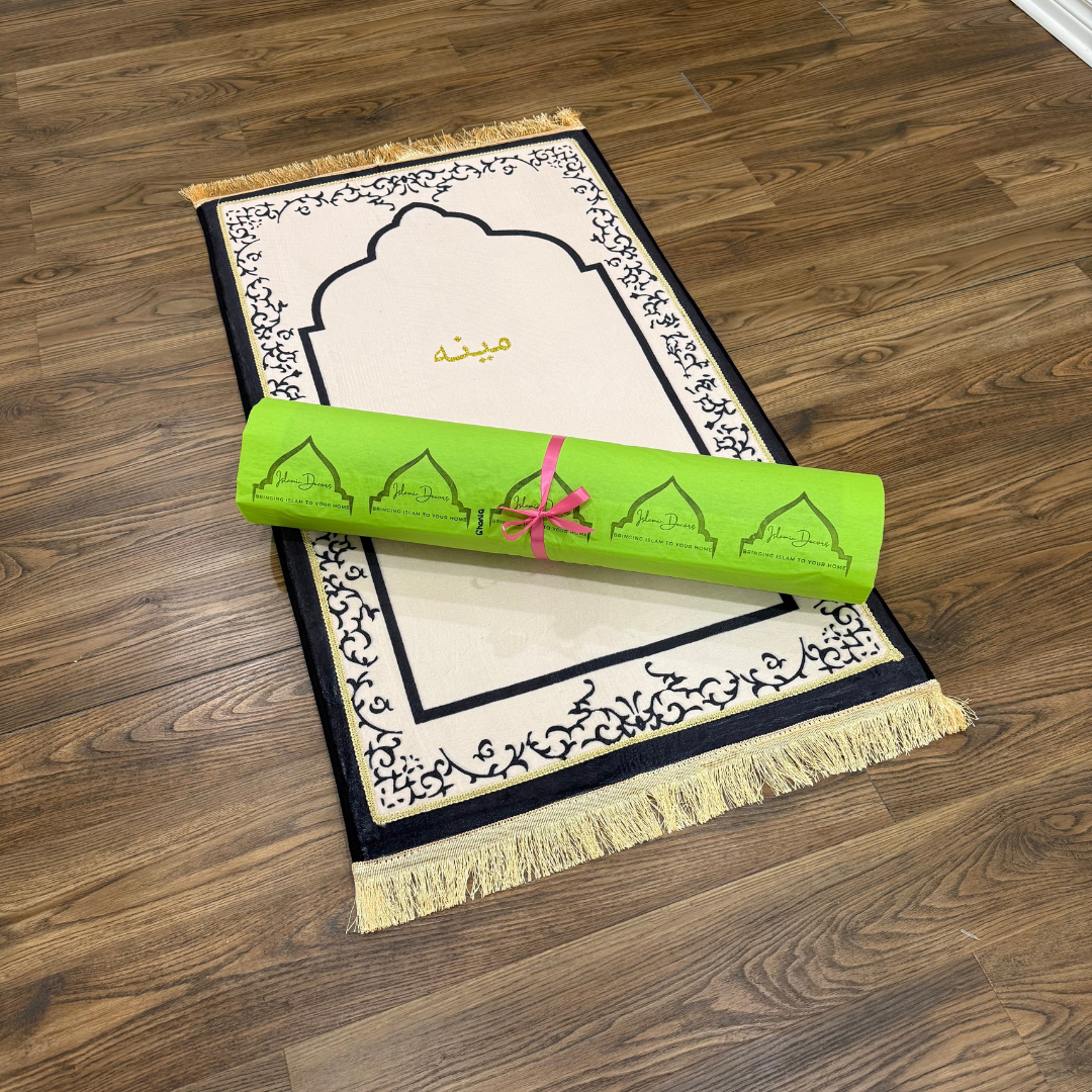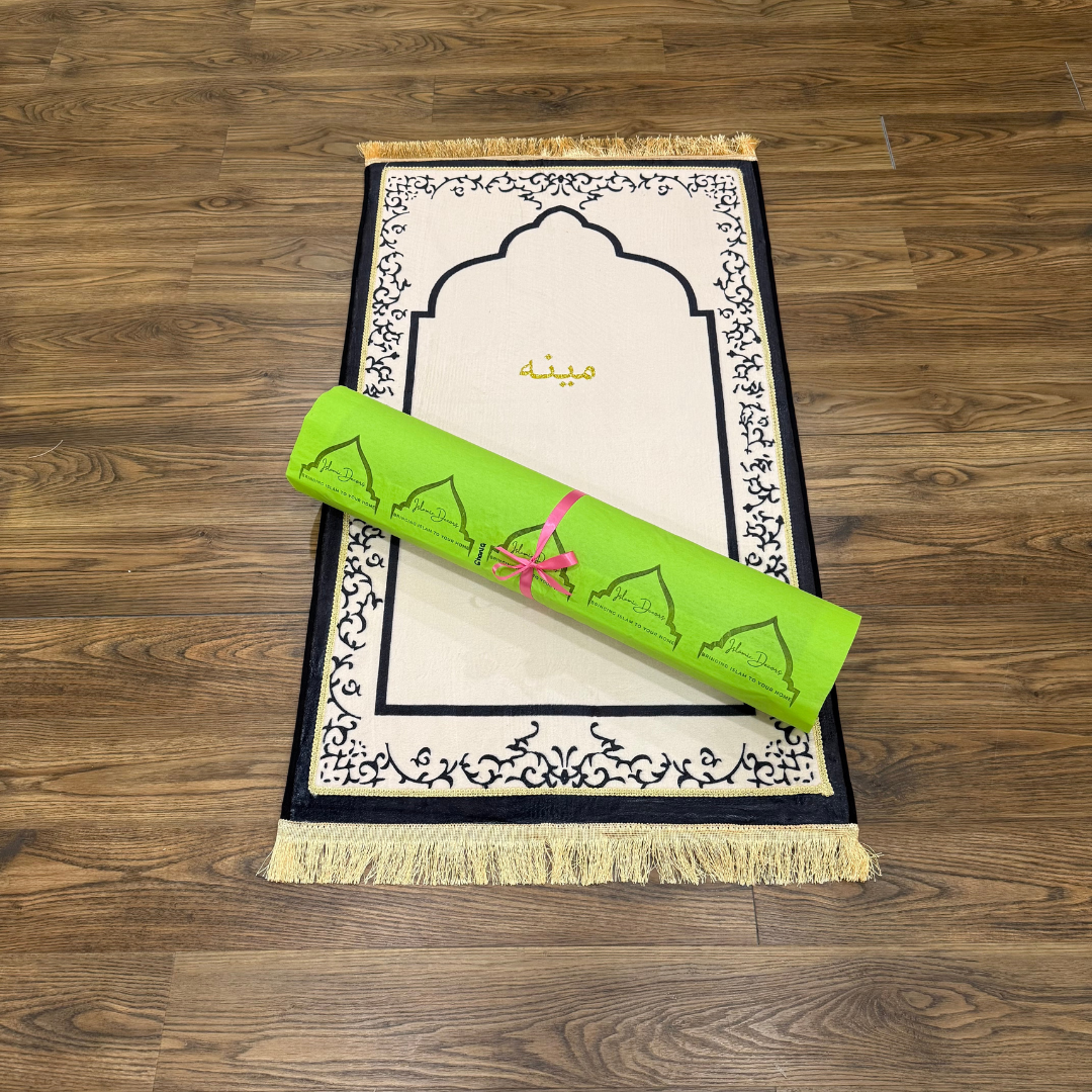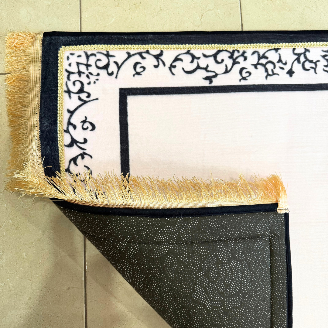 • Design: Off-white mosque-shaped mat with golden border (a timeless and peaceful aesthetic)
