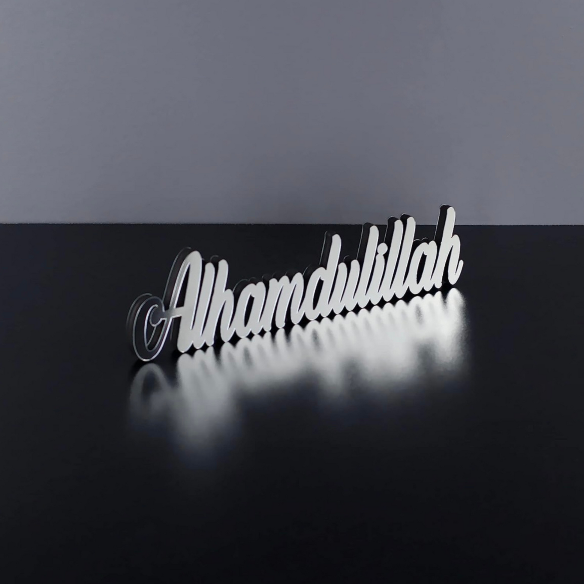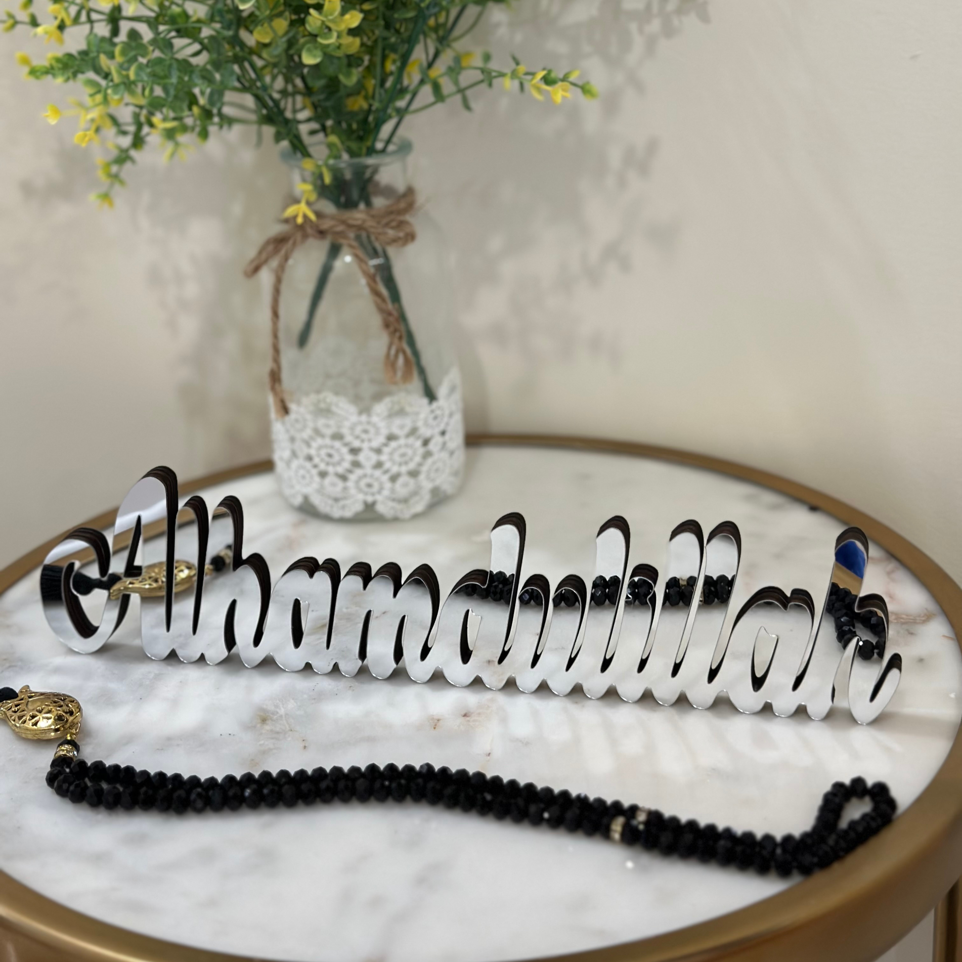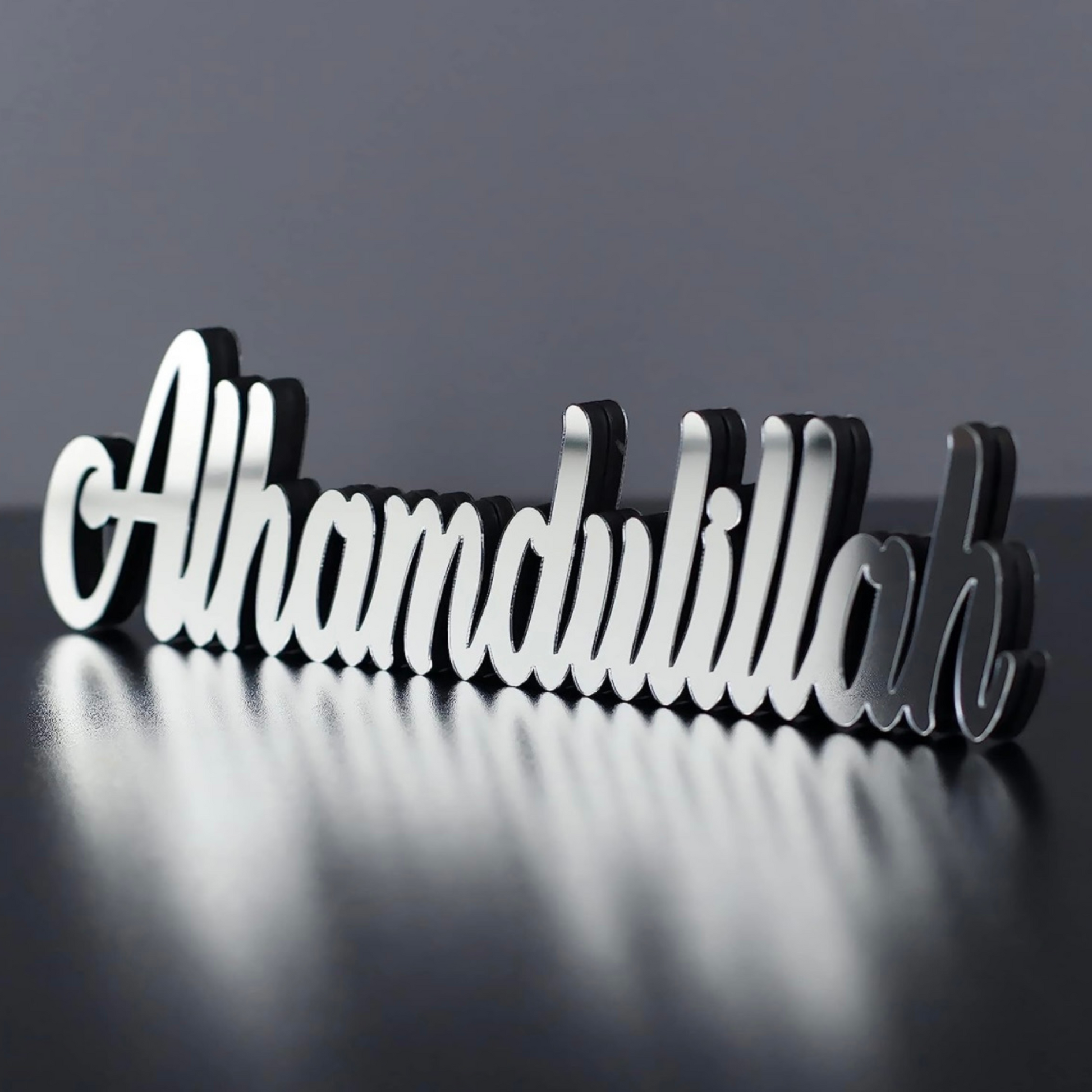 Introducing our Alhamdulillah Table Decor, masterfully crafted in shimmering silver mirror acrylic and anchored with a thick, durable wood core. This elegant piece features the phrase Alhamdulillah (All praise be to Allah) cut in graceful English script—bringing light, meaning, and modern elegance to any table, shelf, or prayer space.