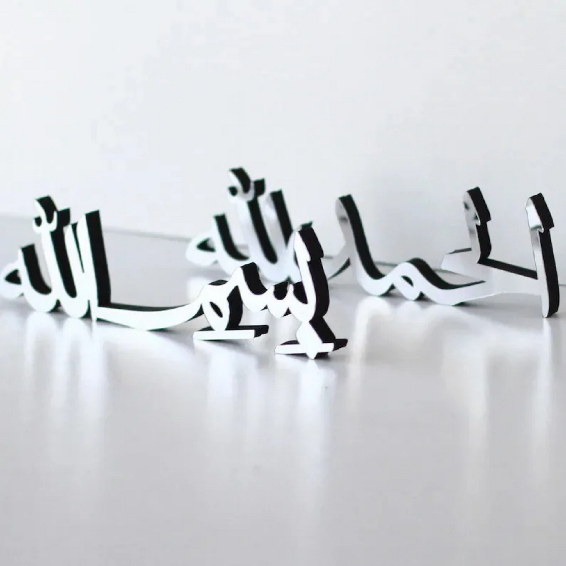 Introducing our Alhamdulillah & Bismillah Table Decor Set—a radiant pair crafted with mirror-finished silver acrylic on both sides and anchored by a thick and strong wooden base. These two meaningful pieces complement each other, merging modern aesthetics with timeless Islamic faith.