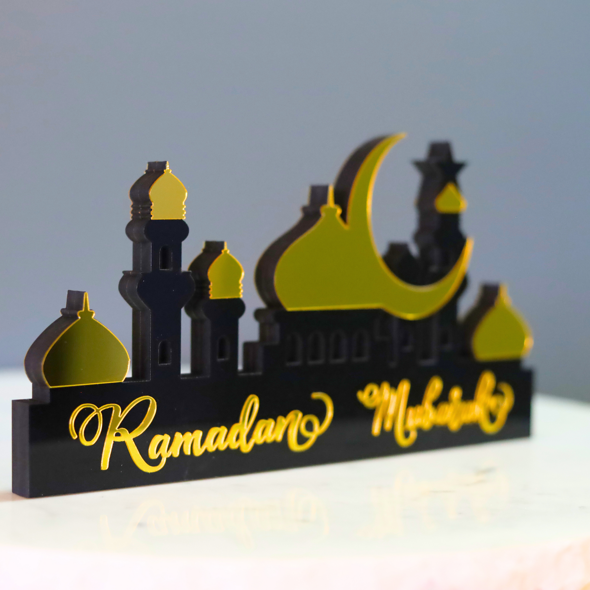 Crafted with a thick MDF wood core and finished with premium black and gold mirror acrylic on both sides, this decor combines durability with sophistication. Its luxurious finish and intricate detailing make it a timeless centerpiece for your Ramadan and Eid celebrations. Measuring 26cm x 14cm x 3cm, it’s the ideal size for any table, shelf, or mantel.