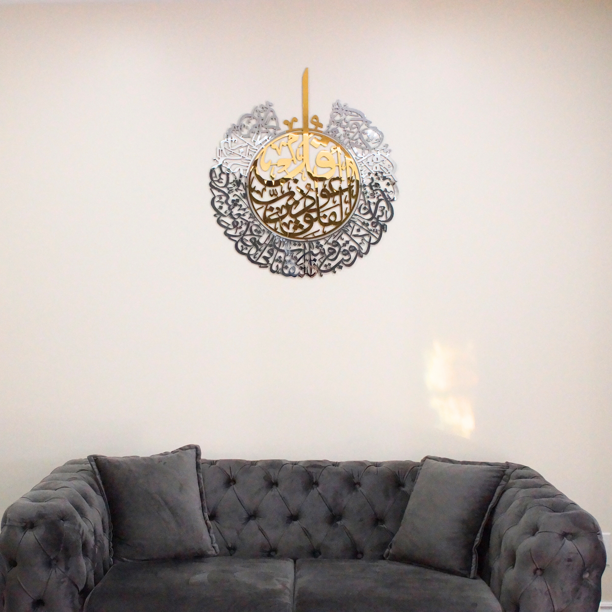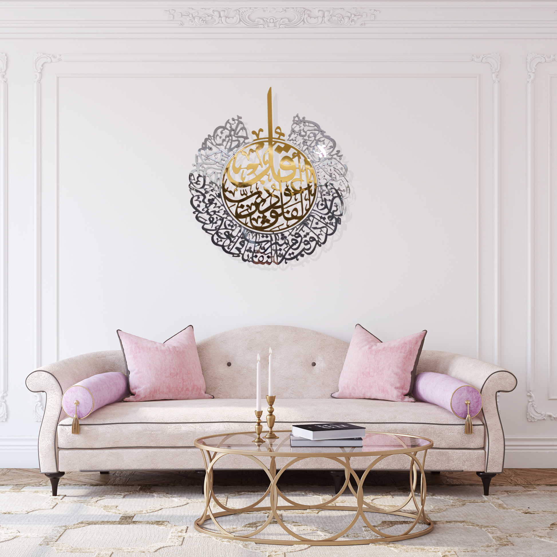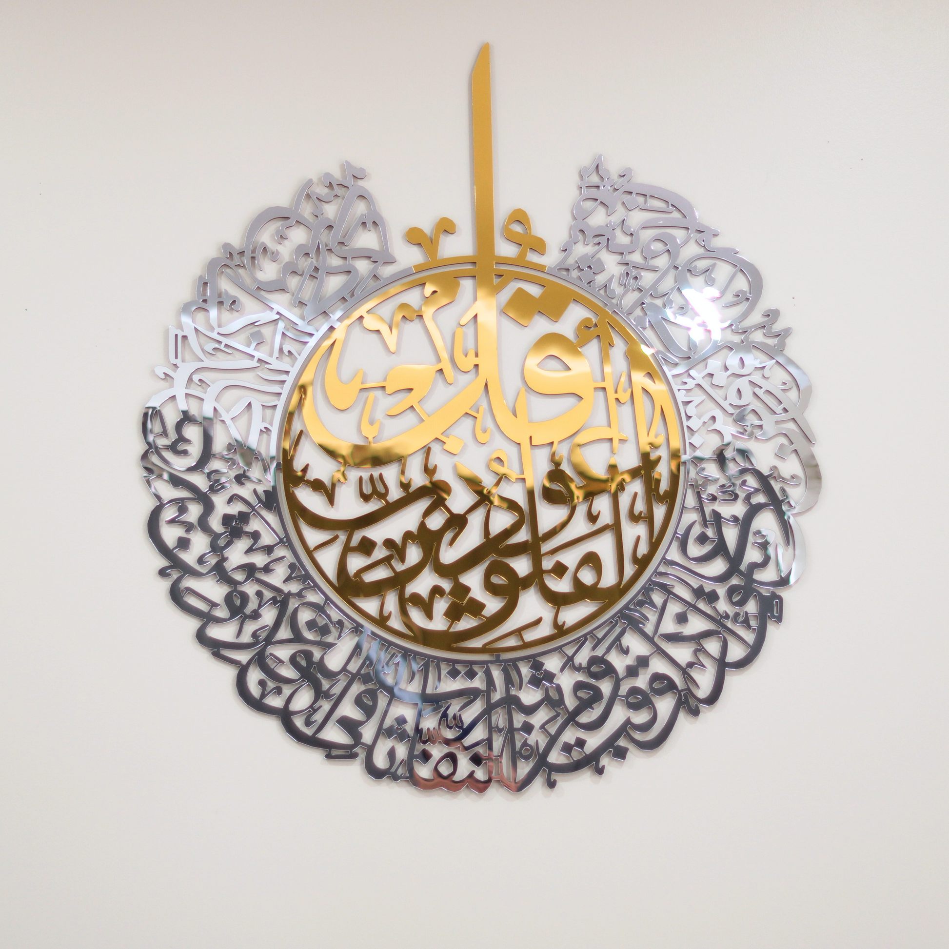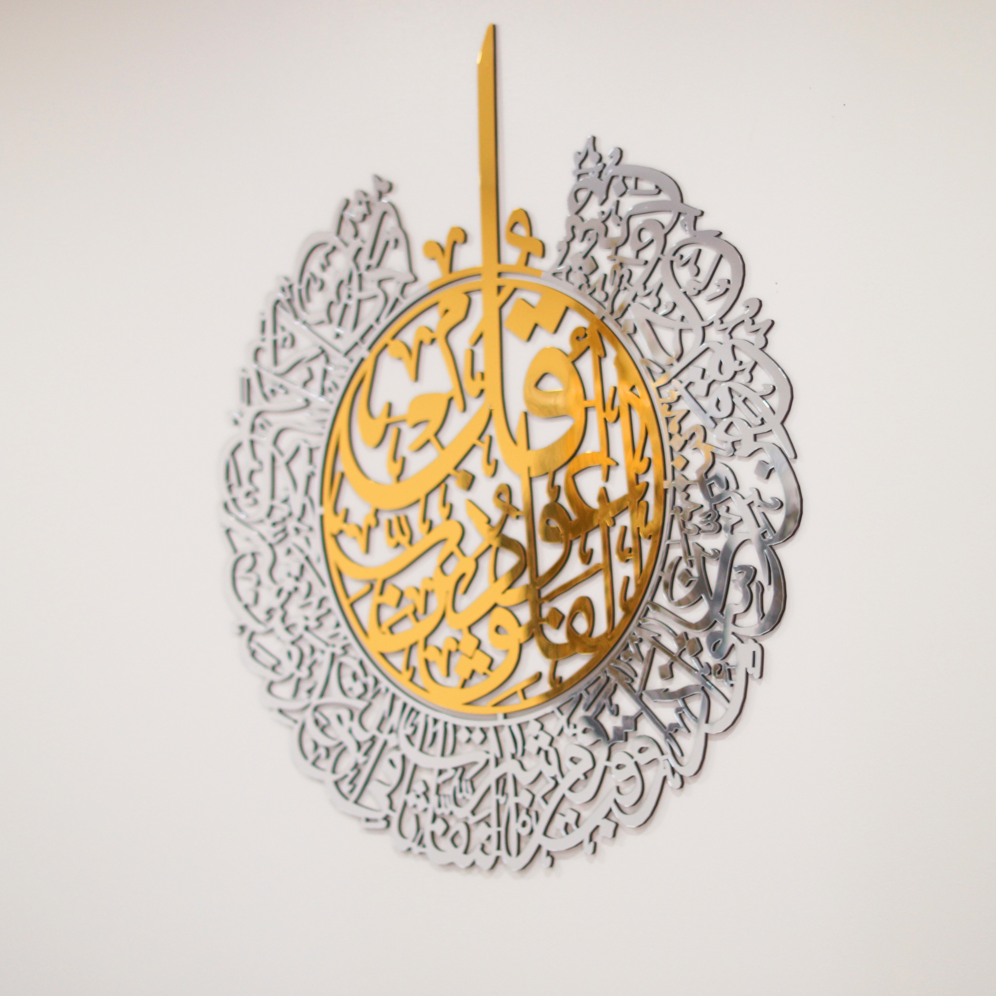 Known as one of the strongest Surahs for protection against jealousy, harm, and hidden dangers, this verse is brought to life in gold and silver mirror acrylic, layered over a thick wooden backing—combining beauty with barakah.