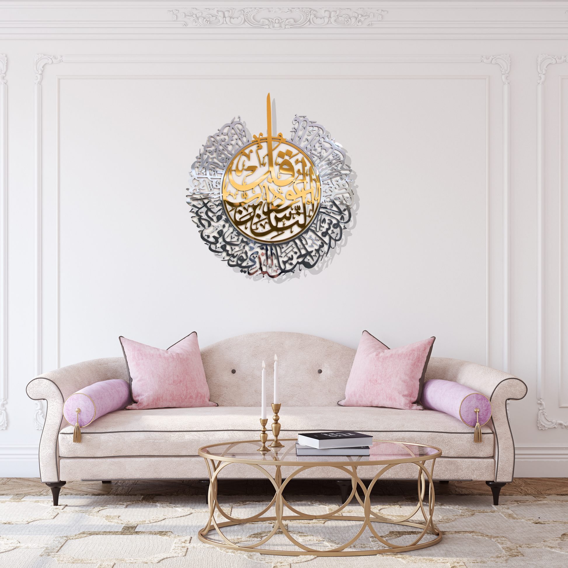Carefully layered with gold and silver mirror acrylic and backed with thick, strong wood, this wall art reflects light and faith at every glance—bringing both beauty and barakah to your home.