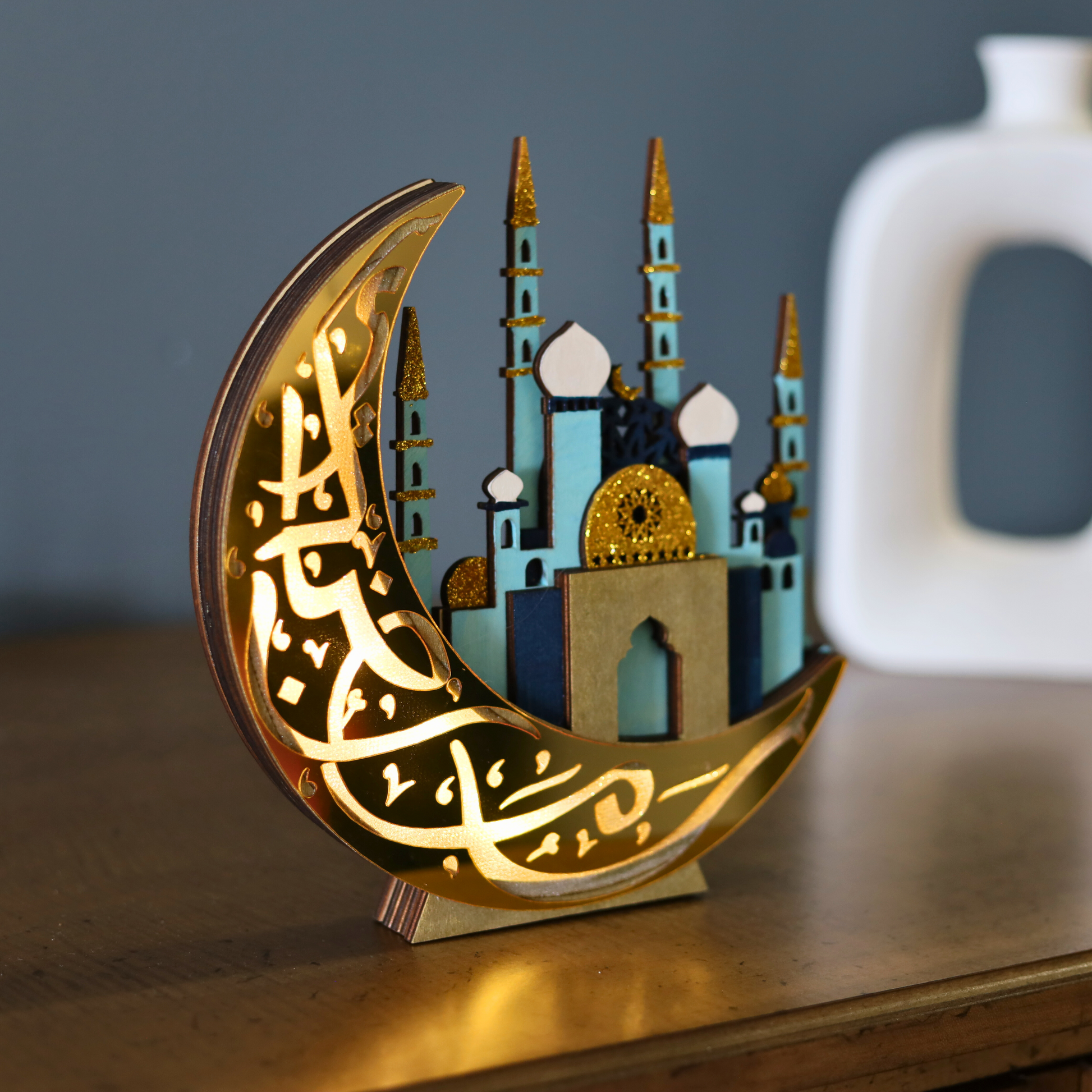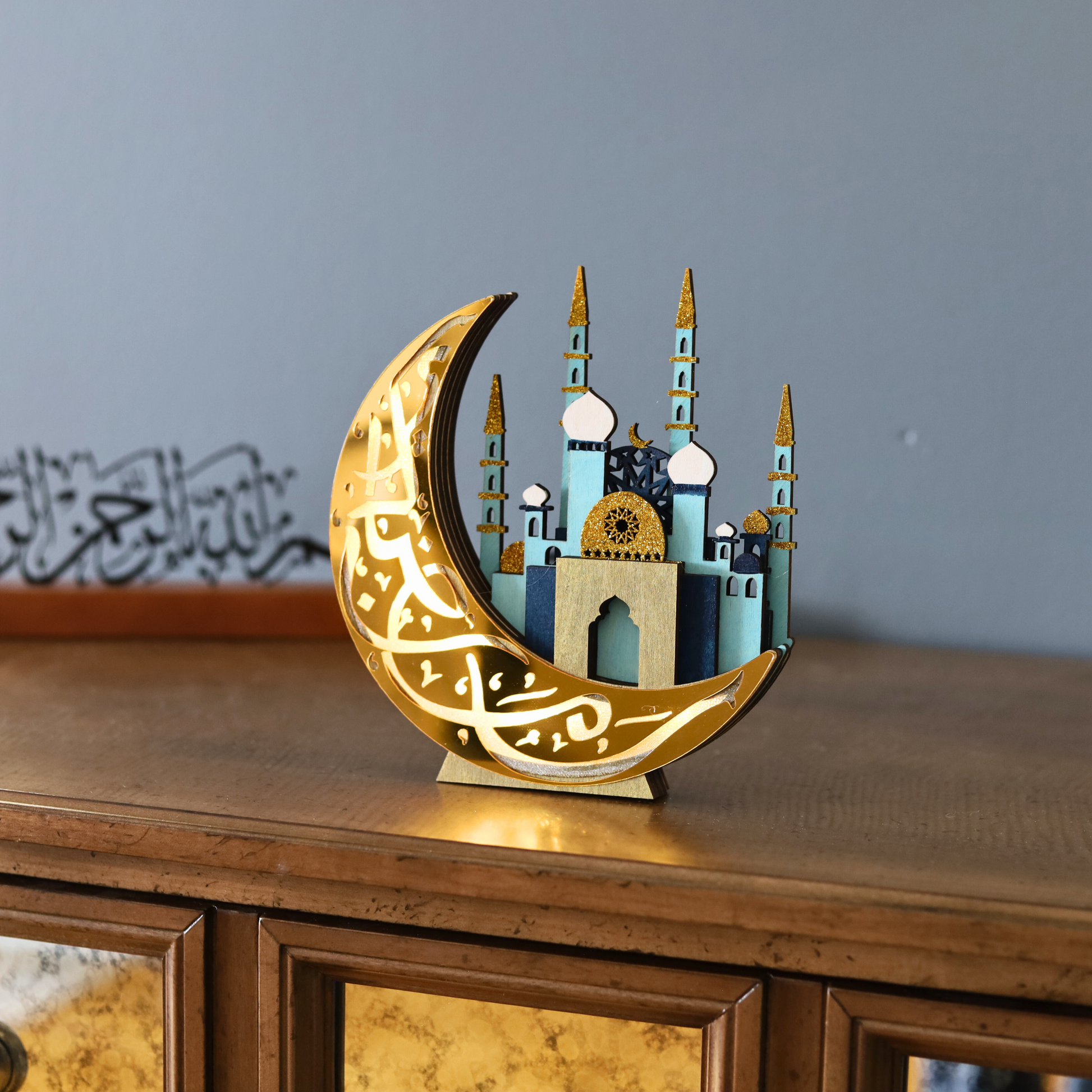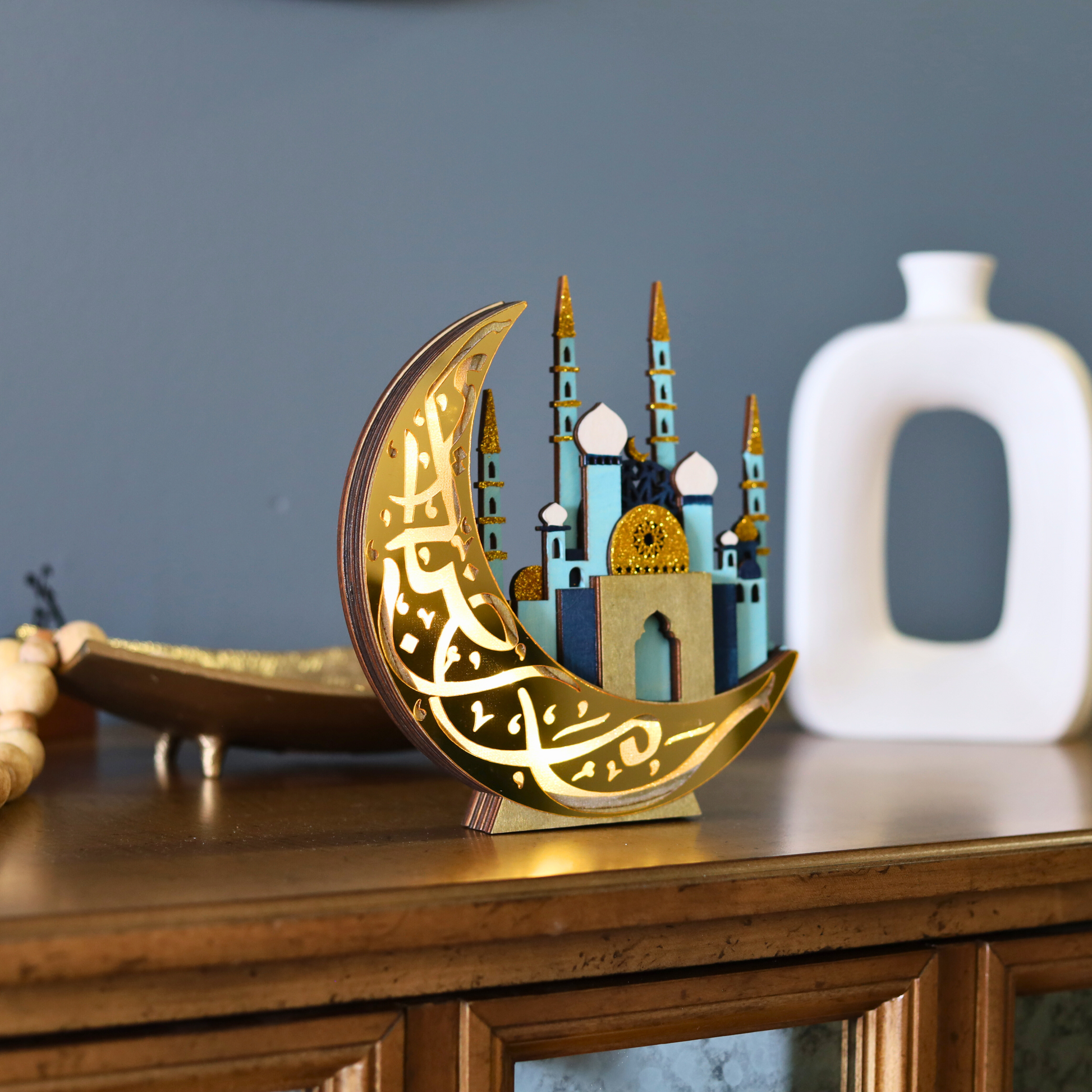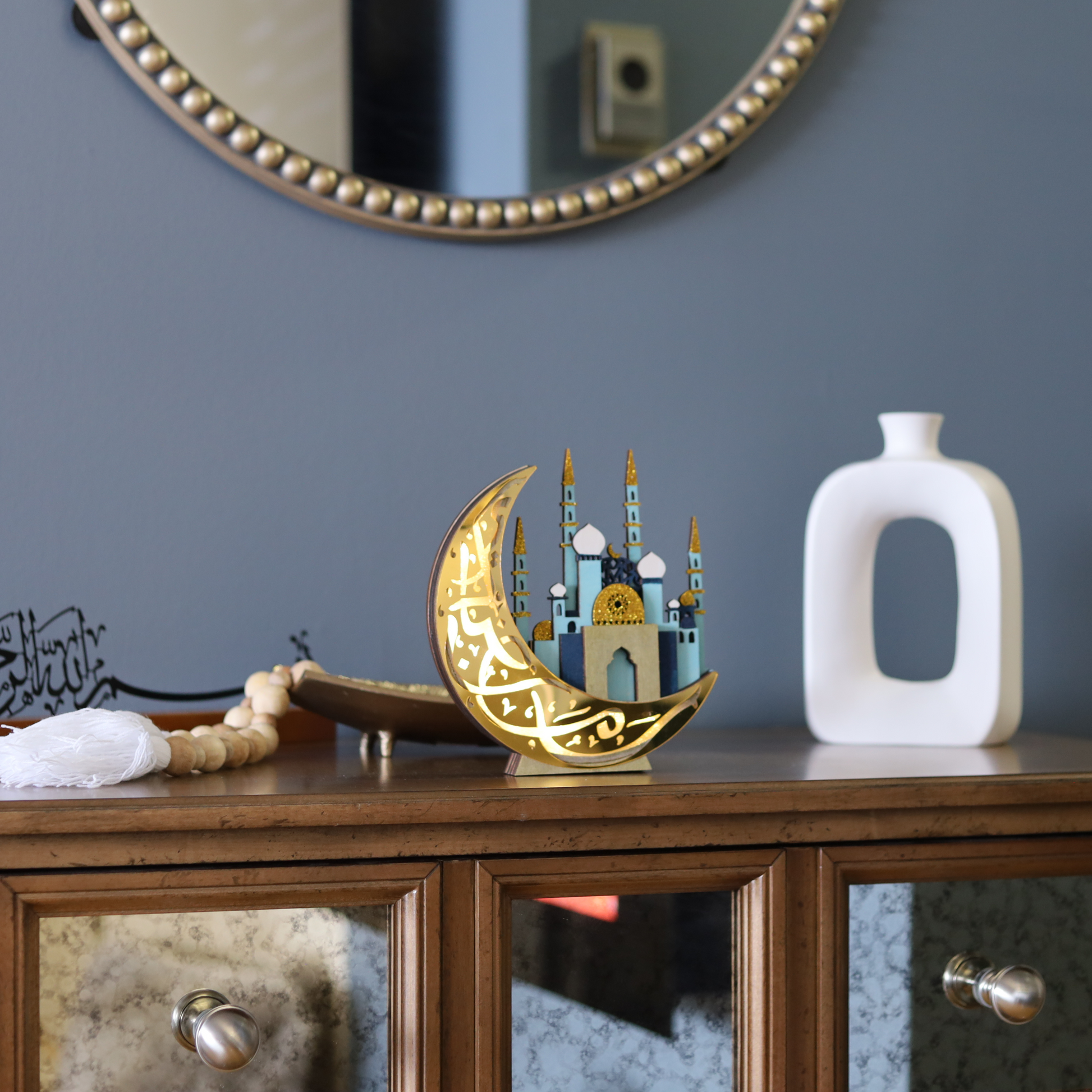 Unique Gold Crescent Moon & 3D Mosque Table Decor