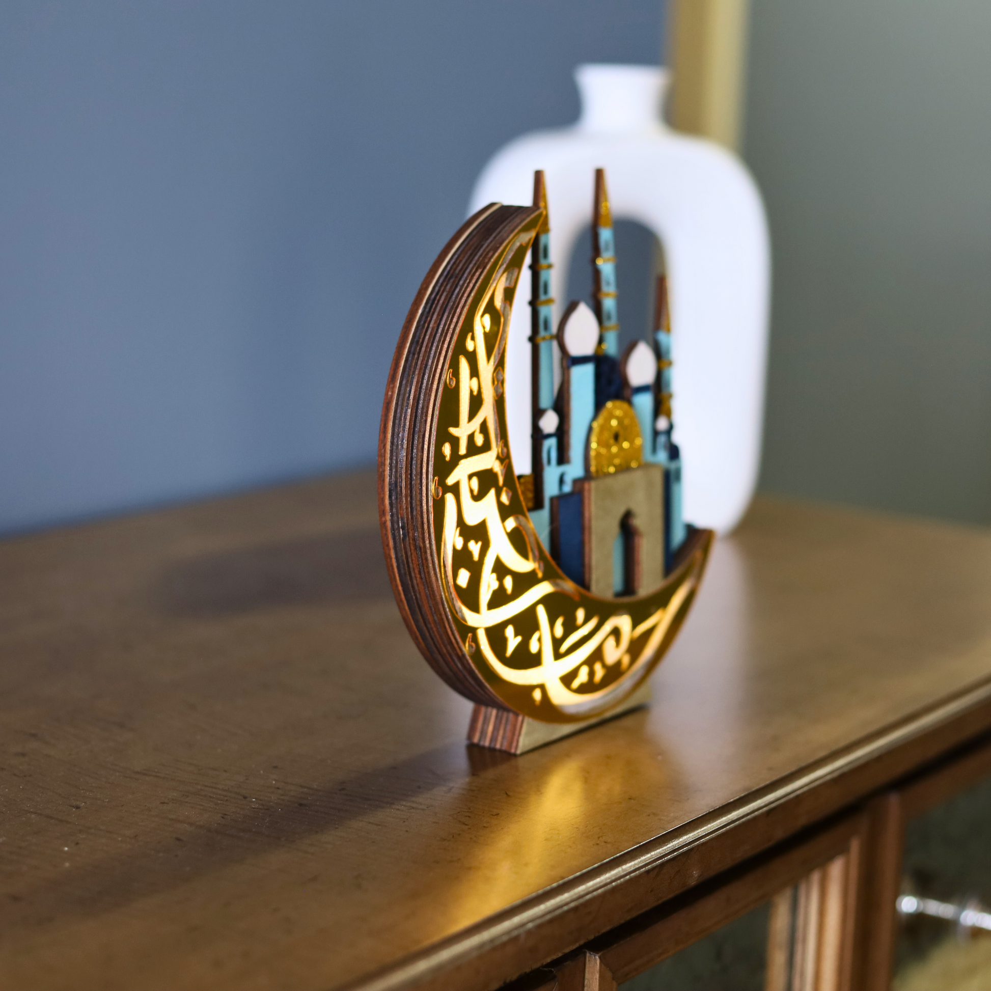 This piece features a gorgeous golden crescent moon, engraved with Ramadan Kareem in graceful Arabic calligraphy, wrapped around a detailed 3D mosque that symbolizes peace and devotion. The built-in warm LED lights softly illuminate the crescent, creating a cozy, spiritual glow that transforms any corner into a place of calm and reflection.