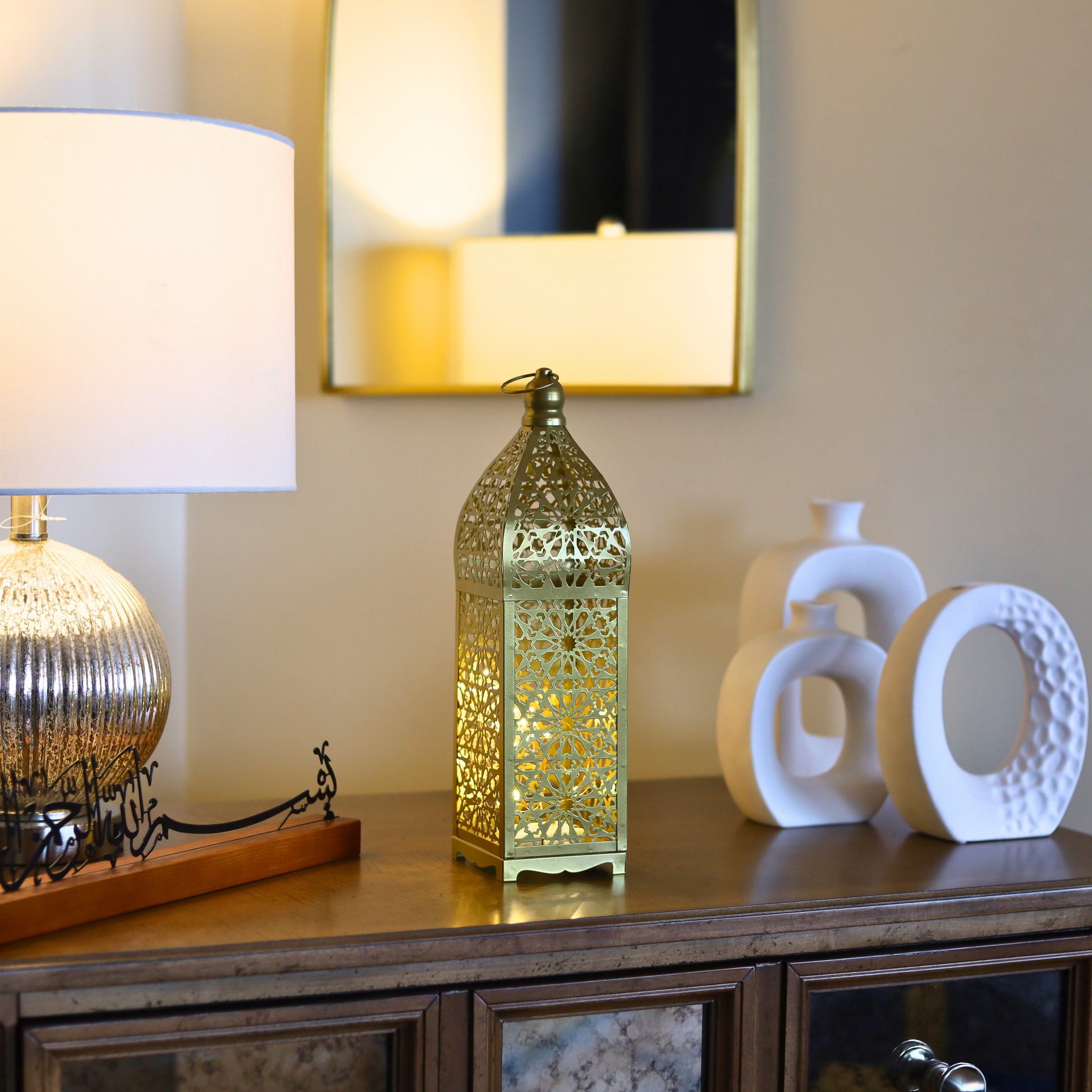 Illuminate your home this Ramadan with this exquisite Golden Metal Lantern, featuring intricate Persian-inspired engravings that cast mesmerizing shadows on your walls. This stunning piece combines tradition and elegance, creating a warm and spiritual ambiance that perfectly complements the holy month.